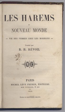 Les Harems du Nouveau Monde. Vie des femmes chez les Mormons. [Female Life among the Mormons. A Narrative of many years' personal experience by the Wife of a Mormon Elder, recently from Utah]. Traduit par B.H. Révoil.