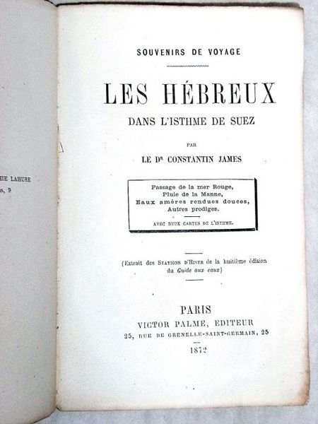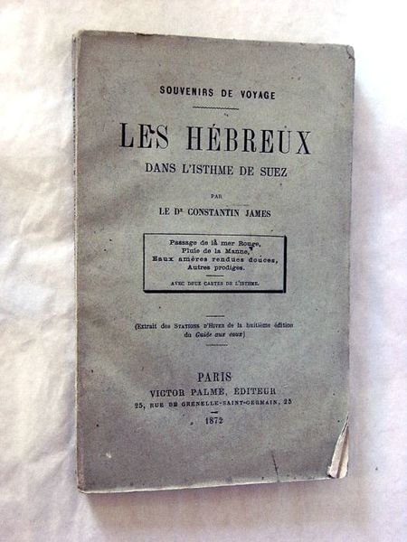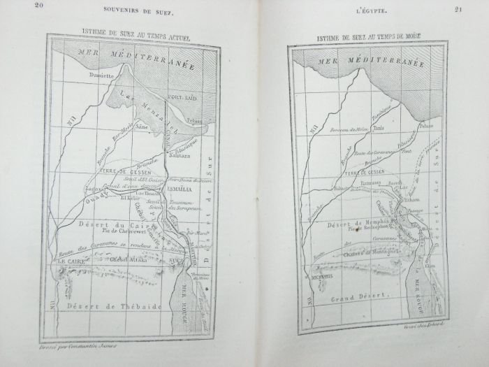 in-8. 2ff. 102pp. 1f. Broché, couverture imprimée (un peu passée). Rousseurs éparses. Non rogné. Feuillets un peu écornés. Première édition dans laquelle l'auteur relate son périple en mer Méditerranée et son séjour en Egypte. Il y décrit notamment les promenades dans Le Caire et Alexandrie, l'illumination des Pyramides, l'inauguration du canal de Suez, et revient sur la traversée de la Mer Rouge par les Hébreux.