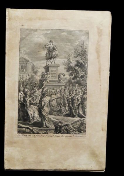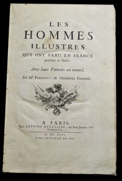 In folio (43,1x28 cm); due tomi: (8), 100 (i.e. 104 pagine 15,16, 65 e 66 i doppie nelle due versioni differenti), (2) pp. e 54 c. di tav. non numerate fuori testo e (4), 102, (2) pp. e 50 c. di tav. non numerate fuori testo. Legature coeve in piena pelle con dorso a 6 nervi e titolo e fregi in oro ai tasselli. Nel secondo volume la pecetta in pelle sulla quale era stampato il titolo è andata persa. Qualche strofinatura e lieve difetto. Due ex-libris applicati allinterno del piatto anteriore del primo volume che attestano lesemplare come appartenuto ad Umberto Tirelli, celeberrimo caricaturista originario di Modena e bolognese dadozione e dottor Mario Tirelli, figlio dello stesso Umberto. Allinterno foglio volante manoscritto nella chiara grafia di Umberto Tirelli, allinizio del novecento, con scheda bibliografica. Scritte a matita al margine alto del primo volume degli inizi del novecento. Altro foglio composto di 4 facciate, fittamente manoscritte da Umberto Tirelli che descrivono e analizzano lopera e le sue peculiarità, in particolare quelle presenti in questo esemplare. Piccolo timbretto nobiliare, abraso ai due frontespizi ed al margine basso bianco del primo ritratto del secondo volume, quasi invisibile e solo in parte leggibile. Allinterno, come in tutti gli esemplari, nel primo volume le tavole si presentano con leggerissima brunitura uniforme e nel secondo volume, invece, sono le pagine a presentare una leggerissima brunitura, il tutto dovuto al tipo della carta utilizzata ma nel complesso esemplare in buone condizioni di conservazione. Uno strappo al margine bianco, senza perdita di carta, nella tavola di pagina 73 con ritratto di Vincent Voiture. Bellincisione realizzata dal Le Clerc allinizio di ogni volume. Lo stesso Le Clerc firma la vignetta alla fine della prefazione ed a pagina 100 del primo volume. Rarissima prima edizione, nella primissima tiratura che presenta i ritratti ed il testo allegato di Antoine Arnauld e Blaise Pascal in questo nostro esemplare seguiti dalle due tavole e quattro pagine di testo che avrebbero corredato la prima edizione alla sua uscita e cioè i ritratti e la vita di Louis Thomassin e Charles du Fresne du Change. I nomi di Pascal e Arnauld compaiono anche nella legenda posta alla fine del primo volume. Infatti, finita lopera, a causa di motivi legati alla censura, prima delluscita dei volumi, fu chiesto a Perrault di eliminare le tavole e le pagine dedicate a Arnauld ed a Pascal. Questi due ritratti, con le pagine corrispondenti vennero sostituiti con due ritratti e la descrizione delle vite di Louis Thomassin e Charles du Fresne du Change. Gli esemplari completi delle tavole e delle pagine di tutti e quattro i personaggi sono molto rari e vennero distribuiti in poche copie prima delluscita ufficiale dellopera. Lantiporta presente allinizio del primo volume fu dipinta da Bonet ed incisa da Edelinck. Le magnifiche tavole coi ritratti furono incise da Gérard Edelinck, Jacques Lubin, Pieter Louis van Schuppen, Claude Duflos, Louis Simonneau, Robert Nanteuil ed Eustache Le Sueur. Qui siamo quindi di fronte alla primissima edizione di questa importante galleria di ritratti e biografie di grandi personaggi di Francia, ritratti dal grande scrittore francese Charles Perrault (Parigi, 12 gennaio 1628 Parigi, 16 maggio 1703), membro dellAccademia di Francia e che divenne universalmente conosciuto per la raccolta di fiabe Histoires ou contes du temps passé, avec des moralités. Lopera venne in seguito presentata con il titolo di Contes de ma mère l'Oye (it. I racconti di Mamma Oca), raccolta di undici fiabe come Cappuccetto Rosso, Barbablù, La bella addormentata, Pollicino, Cenerentola e Il gatto con gli stivali canonizzate nella loro forma proprio nella rielaborazione di Perrault. Lautore, pur riprendendo la versione di Giambattista Basile, riscrisse le fiabe arricchendone abbondantemente limpianto narrativo con trovate ed invenzioni di sua ideazione. Fra i creatori dell'Accademia delle Scienze e al restauro dell'Accademia della Pittura, al momento della nascita nel 1663 dell l'Académie des Inscriptions et Belles-Lettres, Perrault ne venne da subito eletto Segretario a vita. Fra i massimi sostenitori del continuo rinnovamento delle arti, a lui si devono alcuni dei più celebri scritti a favore dellarte del secolo di Luigi XIV contro larte antica. Lopera qui offerta presenta 104 ritratti e biografie di celebri artisti, uomini politici e scienziati francesi come Henry de Lorraine Comte dHarcourt, le Marechal de Luxembourg, Honoré dUrse Chevalier de Malthe, Sebastien de Pontault de Beaulieu Ingenieur et Mareschal de Camp des Armees du Roy, Michel le Tellier, Jean Baptiste Colbert, Pompone de Bellievre, Blaise Pascal, Pierre Gassendi, Nicolas Rigault, Joseph Juste Scaliger, Adrien Valois, David Blondel, Samuel Bochart, Jean Racine, Isaac de Benferade, Philippes Callot, Simon Vouet, Pierre Mignard, Francois Chauveau, Le Cardinal de Richelieu, Jean Pierre Camus, Arnauld Docteur de Sorbonne, Colbert Ministre dEstat, Scevole de Sainte-Marthe, Pellisson, Balzac, Malherbe, Perrault, Sarasin, Voiture, Corneille, Moliere, Quinault, La Fontaine, Poussin, Le Brun, Le Sueur, Calot, Ballin ed altri. Rare in this original edition prior to the intervention of the censorship. Rif. Bibl.: Ebert 16216; Tchemerzine-Scheler V, 181-82; Lipperheide Fb25; Brunet IV 509.