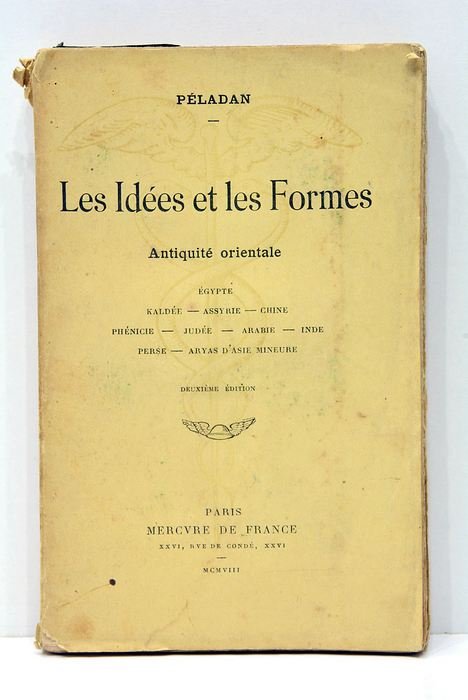 357 pages. 4 feuillets. (18,5x12cm). Broché. Couverture brunie et salie avec taches éparses. Dos frotté légèrement déchiré. Coins émoussés. Cet ouvrage, publié à Paris en 1908, plonge le lecteur dans l'exploration des civilisations de l'Antiquité orientale à travers le prisme de Joséphin Péladan, figure emblématique du symbolisme et de l'ésotérisme de la fin du XIXe siècle. L'auteur, connu pour son intérêt pour les arts et les mystères anciens, offre une perspective unique sur les liens entre les idées philosophiques et les expressions artistiques de ces civilisations lointaines. Dans une époque marquée par une fascination pour l'Orient et ses mystères, cet ouvrage se présente comme une réflexion sur l'influence de l'Antiquité orientale sur la pensée et l'esthétique européennes, écho d'un dialogue interculturel toujours pertinent aujourd'hui. Papier bruni avec petites taches et rousseurs éparses. Petites déchirures marginales. Cahier légèrement déboîté.