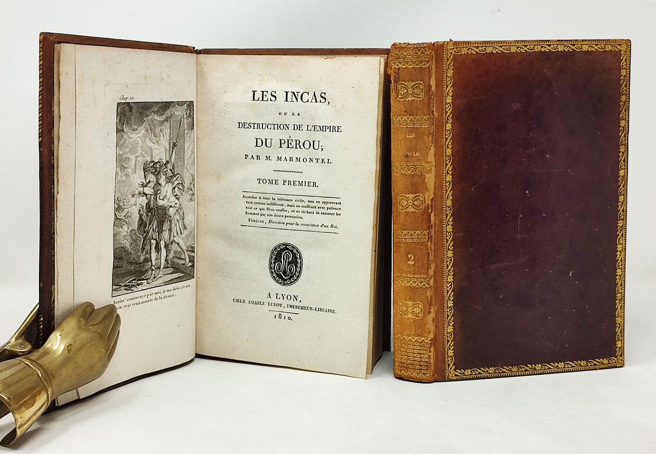 'LES INCAS OU LA DESTRUCTION DE L'EMPIRE DU PEROU' par M. Marmontel. A lyon, chez amable Leroy, imprimeur-libraire. opera completa in due tomi. In entrambi i tomi manca la carta geografica più volte ripiegata su se stessa. Due belle incisioni in nero in anteporta (una in ciascun volume). In appendice al tomo secondo è presente 'Essai sur les romans, consideres du coté moral' (da pagine 253 del volume secondo). Formato: 13 x 20 cm circa. Pagine: XLIV + 290; 349. Stato di conservazione: leggere abrasioni sui margini del dorso ma, nel complesso, due ottimi esemplari. Si ricorda, come già detto in precedenza, che mancano le due carte geografiche (che sono state asportate dai due volumi). copertine in tutta pelle con cornicette floreali in oro sui piatti. Titoli e decorazioni in oro sui dorsi.