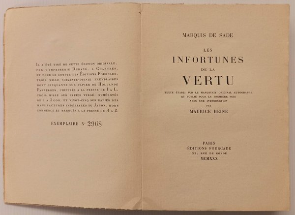 Copertina Morbida<BR>Condizione Molto buona<BR>Lingua Francese.<BR>In-8. 203 pagine, brossura sotto la copertina illustrata. Prima edizione basata sul manoscritto autografo e pubblicata con un'introduzione di Maurice HEINE. Esemplare 2968 di 3075 copie numerate. Una delle 3000 su carta vergata, questa arricchita in frontespizio di una POINTE-SECHE originale in colori di DUBAG, firmata. <BR>