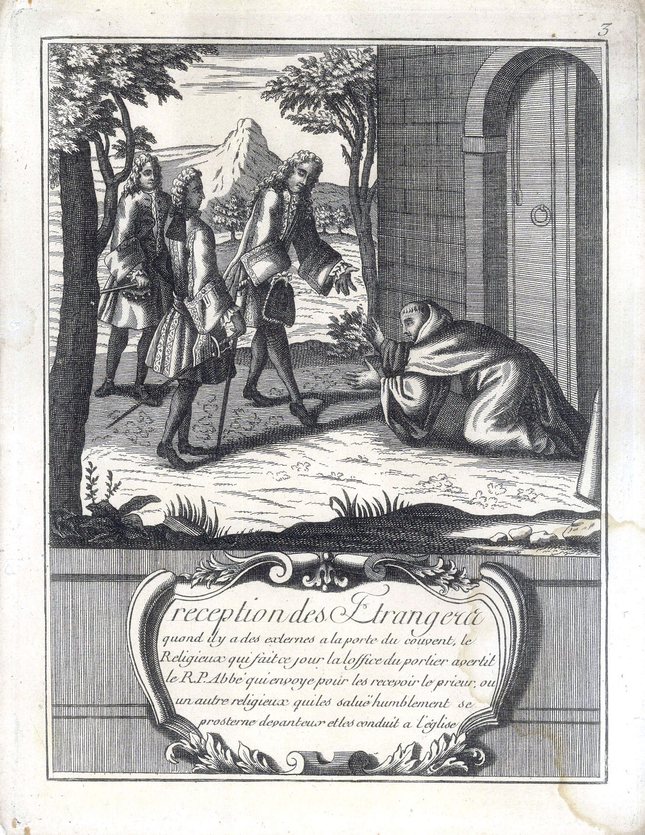 17 planches. (31,5x24 Cm). En feuilles. Accrocs. Mouillures. Taches. 17 gravures de le série "Les jours de la Trappe". Nous avons ici: 1): la première planche avec le portrait du "très Rd Pere Don Armand Jean.", 2): Hospitalité de la Trappe, 3): Reception des Etrangers, 4): Vu ue l'eglise et des cloitres de la Trappe, 5): Le chaeur de labbaye de la Trappe, 6): Chauffoir de la Trappe, 7): Prise d'habit dans l'Abbaye de N. D. de la Trappe, 8): Cuisine de la Trappe, 9): Réfectoire de la Trappe, 10): Travail des mains, 11): Menuserie de la Trappe, 12): Lessive de la Trappe, 13): Vendages de la Trappe, 14): Conference des religieux de la Trappe, 15): Religieux de la Trappe à l'agonie, 16): Conversion du compte de Santena, 17): Visite de l'Abbaye des Clairets.