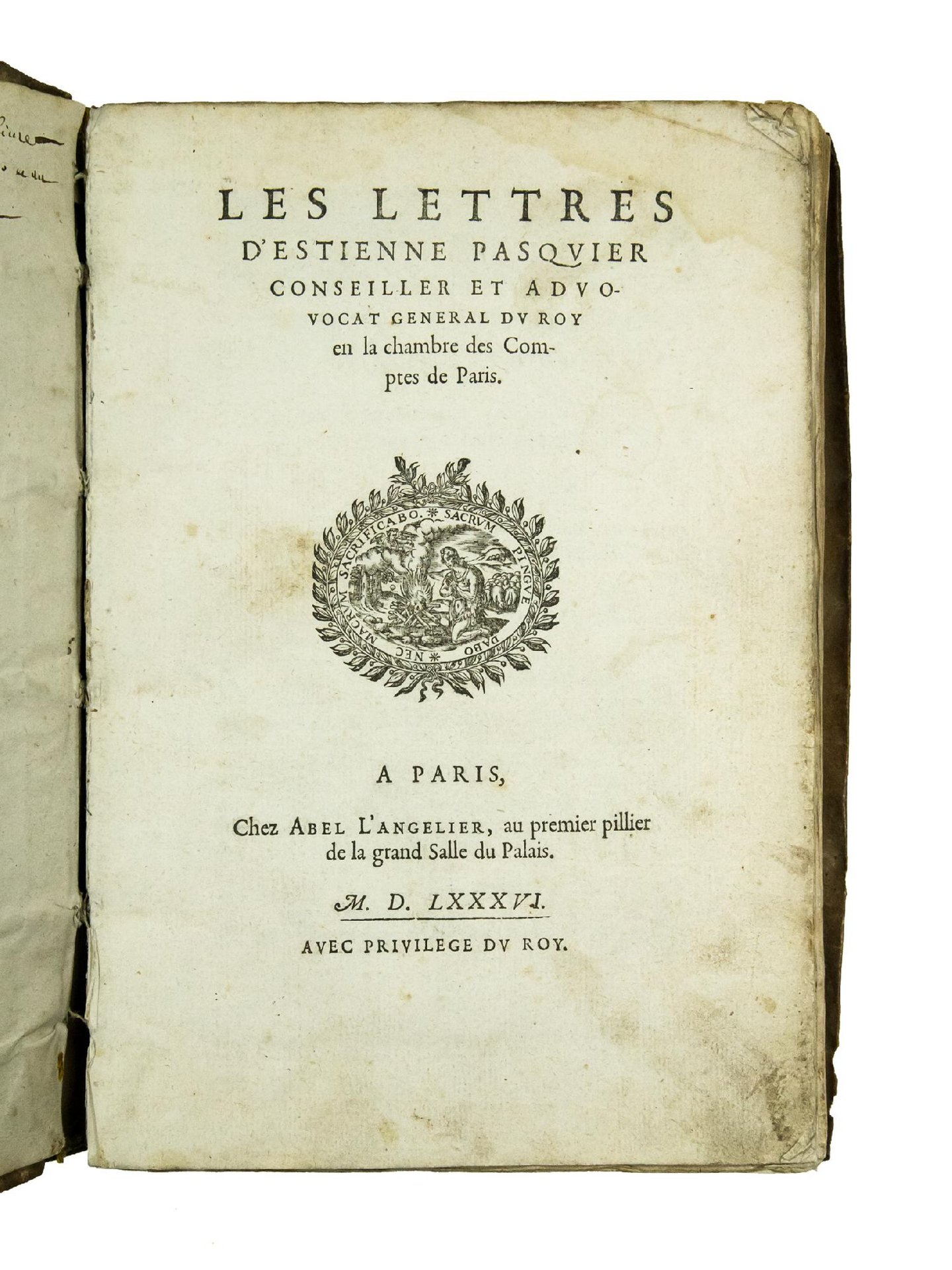 J. Balsamo & M. Simonin, Abel L'Angelier & Franc?oise de Louvain: (1574 - 1620). Suivi du catalogue des ouvrages publie?s par Abel L'Angelier (1574-1610) et la veuve L'Angelier (1610-1620), (Genève, 2002), pp. 218-219, no. 166; D. Thickett, Bibliographie des œuvres d'Etienne Pasquier, (Genève, 1956), p. 46, no. 19.
