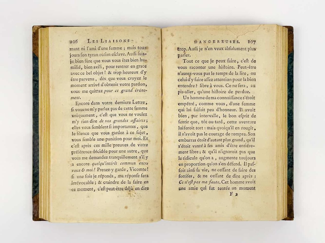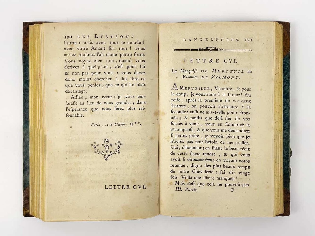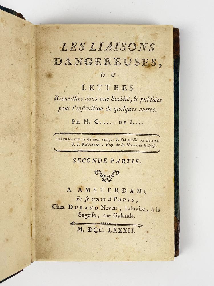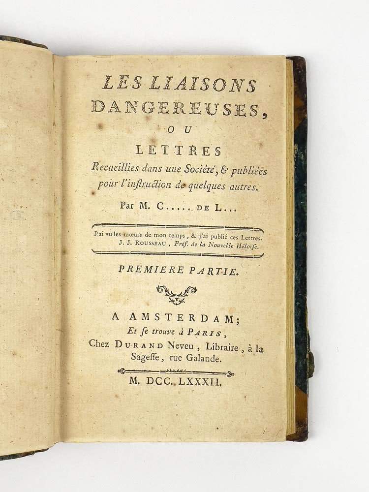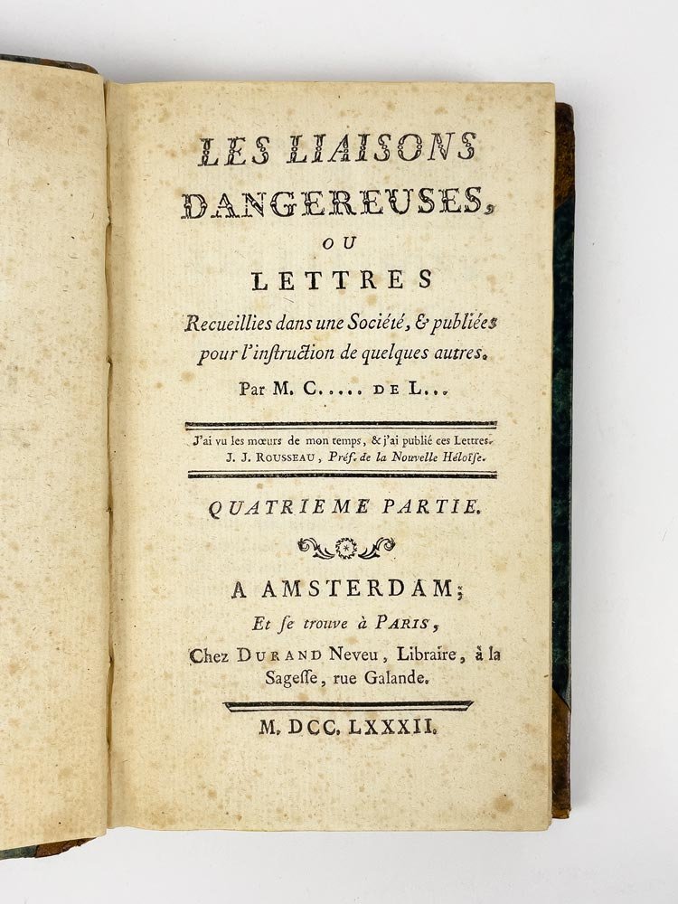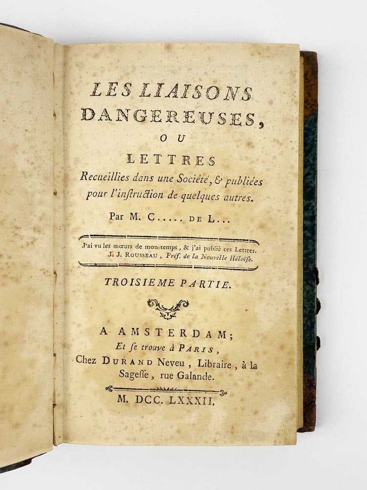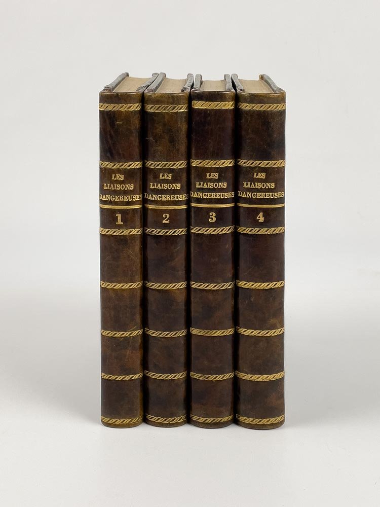 LIBROEdizione originale: voll. 1-3 in prima edizione (A), vol. 4 in terza edizione, ma seconda autorizzata dall’autore (C). Esemplare molto buono (161 x 98 mm; foxing leggero e lievi bruniture passim. Vol. I: pp. 93-97 piccoli fori di tarlo, p. 95 mancanza al margine esterno che non intacca il testo; vol. IV: antico restauro al verso dell’ultima pagina; pp. 97-100 strappetti marginali). Rilegato in quattro volumi, come apparve in originale: la condizione è assai rara, data l’abitudine impostasi al tempo di rilegare l’opera in soli due volumi (Chatelain, Livres du Cabinet de Pierre Berès, 2003, n. 25).Edizione originale di uno dei capolavori assoluti della letteratura francese, entrato nell’immaginario collettivo mondiale anche grazie alle molte trasposizioni cinematografiche: basti ricordare nel 1988 «Dangerous Liaisons» di Stephen Frears (1988), con un cast stellare composto da Glenn Close, John Malkovich, Michelle Pfeiffer, Uma Thurman e Keanu Reeves; e poi «Valmont» di Miloš Forman, con Colin Firth e Annette Bening, vincitore del premio César per scenografia e costumi. «Les Liaisons Dangereuses» vide la luce per la prima volta nella primavera del 1782, più precisamente tra il 7 e il 15 aprile (Brun, «Bibliographie», p. 41). Romanzo epistolare, scritto dal semi-sconosciuto ufficiale di artiglieria Pierre Ambroise Françoise Choderlos de Laclos, metteva in scena le torbide e libertine vicende del visconte di Valmont e della marchesa di Merteuil: «l’audace des ‘Liaisons dangereuses’ ne consistet-elle ni dans la débauche facile au langage cru, ni dans la perversité au premier degré ou la jouissance de faire le mal propre à Sade, mais dans l’art de le dire ou plutôt de l’écrire pour un conaisseur admiratif et un peu vexé, placé en position de voyeur comme le lecteur» («En français dans le texte, n. 174)». Già a partire dall’uscita in rivista, il successo fu immediato e travolgente: il 16 marzo 1782 Choderlos de Laclos firmò un contratto con l’editore Durand Neveu per la stampa di 2000 copie dell’opera, e già il 21 aprile l’autore acconsentiva alla pubblicazione di una seconda edizione; alla fine dell’anno si contarono ben 16 edizioni differenti, alcune autorizzate, altre invece, la maggior parte, contraffazioni (Brun, «Bibliographie», p. 5; Talvart - Place, II, pp. 290-300). È possibile oggi orientarsi in questo complesso labirinto di stampe solo grazie alle preziose bibliografie approntate da Talvart - Place, Ducup de Saint-Paul e soprattutto, da ultimo, Max Brun: possiamo dunque affermare con certezza che le prime tre sezioni dell’esemplare qui presentato sono in tutto conformi all’edizione originale (siglata A nella «Bibliographie» di Brun, pp. 8-10 e 40-41). L’ultima sezione invece corrisponde all’edizione siglata C da Brun, la ristampa autorizzata da Choderlos de Laclos tramite l’addenda al contratto del 21 aprile con l’editore, che seguiva a strettisimo giro l’edizione B: «Durand Neveu, harcelé par ses lecteurs, avant de publier C, prévue dans l’additif du contrat, a édité hâtivement B» (Brun, «Bibliographie, »p. 43). In quest’ultimo volume gli errori dell’edizione A risultano ormai corretti ed è stato dunque soppresso l’Errata alla fine del volume.Talvart - Place, «Bibliographie des auteurs modernes de langue française», II, p. 290-300; M. Brun, «Bibliographie des éditions des ‘Liaisons dangereuses’ portant le millésime 1782», Le livre et l’estampe, 1963; M. Brun, «Contribution bibliographique à l’étude des éditions des ‘Liaisons dangereuses’ portant le millésime 1782», in «Bulletin du bibliophile», 1958; J.-M. Chatelain, Livres du Cabinet de Pierre Berès, 2003, nº 25.