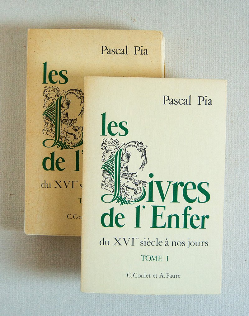 PRIMA EDIZIONE. 2 voll. 413 pp.; 414-839 pp. Testo su doppia colonna. Tiratura a 900 esemplari di cui i primi 100 su carta di lusso Ingres. Pascal Pia, era lo pseudonimo del celebre critico letterario, giornalista e scrittore Pierre Durand. In questa bibliografia riunisce i libri riuniti nella sezione “Enfer” nella Bibliothèque Nationale che spaziano dal XVI al XX secolo. Si tratta essenzialmente di libri erotici o generalmente ritenuti contrari al buon costume. Una risorsa inestimabile.
