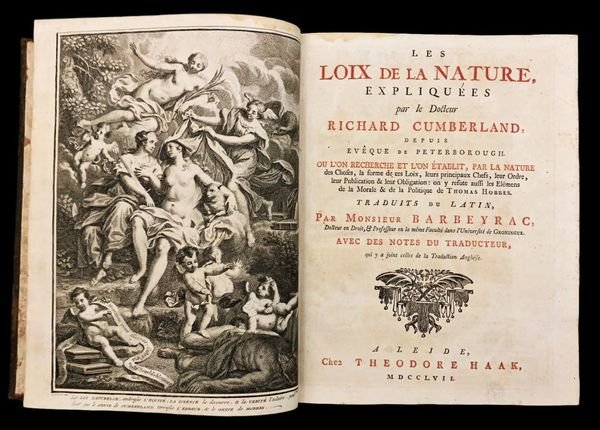 In 4° grande (24x18,5 cm); XXVIII, (2), 435 (i.e. 425),(1, errata), (8, table des matieres) pp. e una bellissima tavola incisa di antiporta. Bella legatura coeva in piena pelle spugnata con titolo e ricchissimi fregi in oro ai tasselli. Dorso a 5 nervi. Carte uniformemente e leggermente brunite come tipico delle opere stampate allepoca a Leida. Nel complesso esemplare in buone-ottime condizioni di conservazione. Lopera si avvale della traduzione e delle note di Barbeyrac (1674-1744) che fu professore di storia e diritto civile a Losanna nel 1711 e di diritto pubblico a Groningen nel 1717. La sua fama si basa principalmente sulla prefazione e sulle note della sua traduzione del De Jure Naturae et Gentium di Pufendorf. Prima edizione con questo titolo ed edizione definitiva di questa traduzione del più importante scritto del celebre scrittore, filosofo e teologo inglese, Richard Cumberland (Londra, 15 luglio 1631 Peterborough, 9 ottobre 1718) che è considerato lautore fra i massimi oppositori alle teorie di Hobbes sulla natura dell'uomo, la natura della moralità e l'origine della società. Lautore che fu anche vescovo di Peterborough, pubblicò la sua prima opera, quella qui appunto presentata, nel 1672. Il lavoro divenne da subito uno dei testi basi dellutilitarismo contrapposto allegoismo etico di Hobbes. Richrd, attivo nel movimento latitudinario, del quale faceva parte anche Locke, fu molto vicino ai platonici di Cambridge. Nel 1670 divenne rettore dellAll Saints di Stamford. Lopera non è solo una critica alle teorie di Hobbes, ma assorbe e neutralizza molte delle sue intuizioni arrivando, però, a creare una nuova teoria politica ed etica, che è arrivò ad influenzare in seguito, in modo profondo, giuristi e filosofi che si cimentarono nello studio del diritto naturale e dell'etica, come ad esempio Locke, Pufendorf, Hutcheson e Shaftesbury, così come molta filosofia dell'Illuminismo francese. Il presente lavoro influenzò notevolmente la comprensione e l'accoglienza di Hobbes in Francia. Insieme alla "On the Law of War and Peace" di Grotius e "De jurae naturae" di Pufendorf è considerata il testo base della Legge Naturale. Pufendorf che elogiò moltissimo il lavoro di Cumberland citandolo più volte nel suo capolavoro, contribuì a rendere celebre la sua dottrina del bene comune come legge suprema della moralità, anticipando e influenzando la direzione che la filosofia etica avrebbe, poi, preso nel XVIII secolo. "His combination of a strong critique of innate ideas and assertion of the moral community with God was a contributing factor in the formation of the kind of empirically based natural providentialism, or natural religious teleology, which soon became the framework or natural law thinking and, indeed, for the mainstream of Enlightenment moral thought." (Haakonssen, Natural Law and Moral Philosophy", p. 51). Nel suo "De legis naturae" Cumberland confuta le di Hobbes sulla costituzione dell'uomo, la moralità, l'origine della società, ecc. e dimostra che lo stato della natura non è uno stato di guerra. Secondo Cumberland, il fine primario dell'uomo non è il vantaggio personale e il potere non è il fondamento della società. Propone una nuova dottrina della moralità che è ancora basata sul diritto naturale, ma che è accompagnata da una critica costante delle opinioni di Hobbes. Tali opinioni gli sembrano sovversive della religione, della moralità e della società civile. Vede la legge della natura come capace di sottolineare ciò che promuoverà il bene comune, e crede che la legge della natura possa essere dedotta osservando fenomeni fisici e mentali. Pertanto, Cumberland concorda con Hobbes nel tentativo di fornire un resoconto naturalistico della forza normativa dell'obbligo e nel tentativo di stabilire un dettato razionale ma si oppone a Hobbes, nel modo in cui questi possono essere derivati. Esemplare in bellissima legatura coeva ed in buone condizioni di conservazione. Rif. Bibl.: Brunet II: 442.