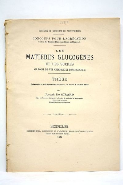 Les matières glucogènes et les sucres au point de vue chimique et physiologique. Thèse présentée et publiquement soutenue, le lundi 8 juillet 1872. Concours pour l'agrégation. Faculté de Médecine de Montpellier.