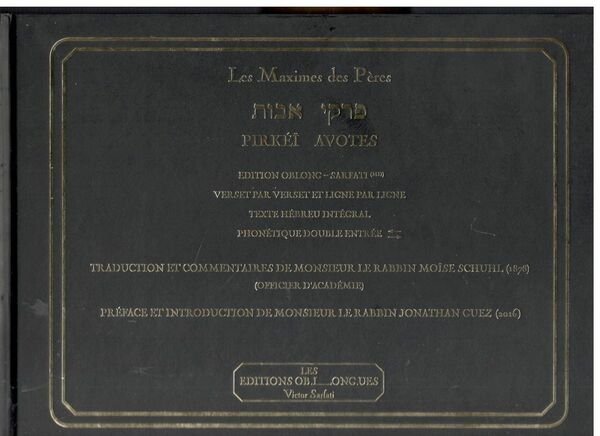 Les maximes des Pères. Pirkéï avotes. Édition Oblong - Sarfati verset par verset et ligne par ligne. Texte hébreu intégral, phonétique double entrée. Traduction et commentaires de monsieur le rabbin MoÏse Schuhl (1878). Préface et introduction de monsieur le rabbin Jonathan Guez