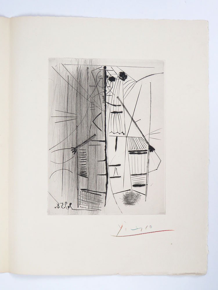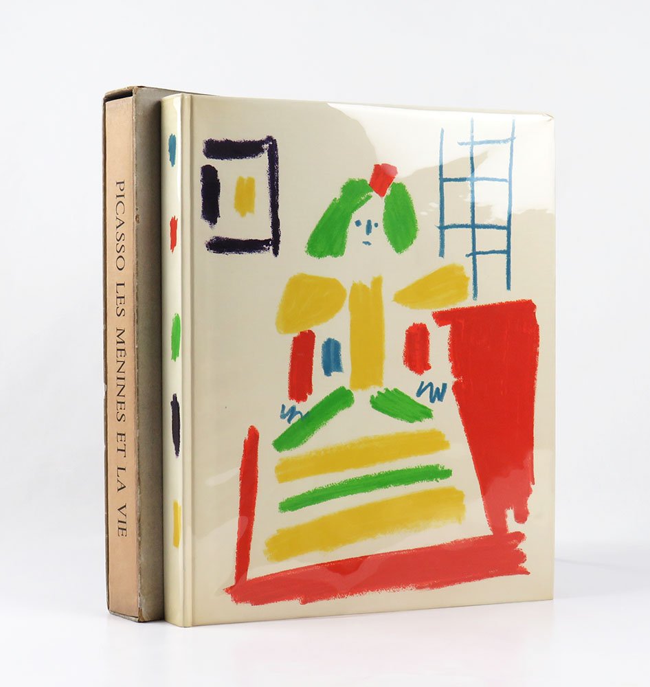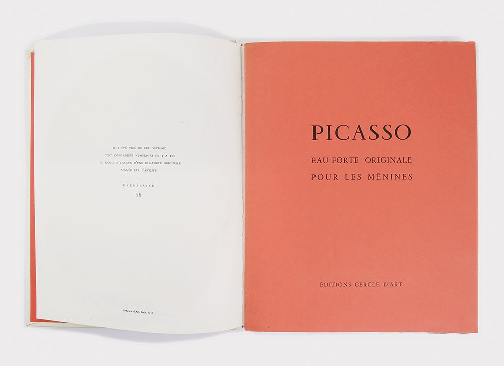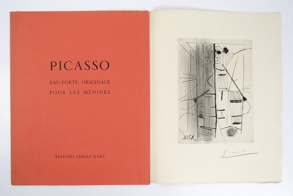 LIBROEdizione originale, tiratura di testa.CON AUTOGRAFO.Esemplare 89/100, in ottime condizioni di conservazione (lievi segni d’usura perimetrali al cofanetto), ben completo dell’acquaforte originale: «PICASSO: eau-forte originale pour Les Ménines»; carpetta in carta arancio mattone con titolo stampato in nero al piatto anteriore, 325 x 260 mm, contenente un bifolio in carta di pregio in barbe con l’incisione protetta da velina: acquaforte a bulino, puntasecca e roulette, 197 x 148 mmn alla battuta, datata in lastra «9.9.58», stampata nell’atelier parigino di Roger Lacourière, elegantemente firmata a mano dall’artista con matita multicolore. In eccellenti condizioni (minima lacerazione senza perdite alla giuntura bassa della carpetta contenitiva).Rarissima “grand papier” tirata in centoventi esemplari, di cui solo cento numerati e i restanti venti “hors commerce”. «Les Ménines et la vie» pubblica i cinquantotto dipinti composti nel 1957, mentre l’artista studiava e rielaborava il grande olio «Las Meninas» di Velázqeuz (1656): sono per la maggior parte una variazione sul tema delle damigelle, oltre a nove colombe, tre paesaggi e un ritratto della compagna Jacqueline Roque. Come sempre in questi libri d’arte francesi pubblicati nel decennio 1950-60, la qualità della resa coloristica è eccezionale, garantita dalla stamperia dei fratelli Draeger; così che Les Ménines è un libro da sfogliare incantandosi, pagina per pagina, di fronte alle meraviglie che Picasso continuava a sfornare a settantasei anni. Le tele originali sono oggi conservate al Museu Picasso di Barcellona, dove riempiono da sole un’intera stanza, dedicata non a caso al curatore dell’edizione, l’amico di una vita Jaime Sabartes: per anni segretario particolare dell’artista, alla sua morte, nel 1968, Picasso donò la serie delle «Meninas» al museo con la specifica istruzione di allestirne una sala in onore dell’amico. -- La splendida acquaforte, realizzata appositamente per questa edizione, è presente in rilevanti collezioni pubbliche e private, tra le quali per esempio il MoMa di NewYork: nelle parole di Julia Stimac, «Picasso’s engraving for the deluxe copies is a remarkable composition: a bold line down the centre recalls the position of Velázquez’s canvas in the 17th-century composition and the two sides (the left greyed) thus come to be read as a shapeshifting play of artist and model, while further to the right simple striations effectively evoke Picasso’s terrace and workspace» nella celebre villa «La Californie» a Cannes, residenza dell’artista dal 1955 al 1961. -- «Supposons que l’on veuille copier les “Ménines” purement et simplement, il arriverait un moment, si c’était moi qui entreprenais ce travail, où je me dirais: qu’est-ce que cela donnerait si je mettais ce personnage-là, un peu plus à droite ou un peu plus à gauche? Et j’essaierais de le faire à ma manière sans plus me préoccuper de Vélasquez. Cette tentative m’amènerait certainement à modifier la lumière ou à la disposer autrement, du fait que j’aurais changé un personnage de place. Ainsi, peu à peu, j’arriverais à faire un tableau “Les Ménines” qui, pour un peintre spécialiste de la copie, serait détestable; ce ne seraient pas “Les Ménines” telles qu’elles apparaissent pour lui sur la toile de Vélasquez; ce seraient mes “Ménines”…» (Pablo Picasso).Bloch, Picasso: Catalogue de l’oeuvre grafe et lithographie, n. 857; Cramer, Picasso les livres illustrés, n. 97; Monod, Manuel, n. 9090; Stimac, Picasso: Les livres d’artiste, the collection of Mr.A*** (NewYork 2019), p. 162