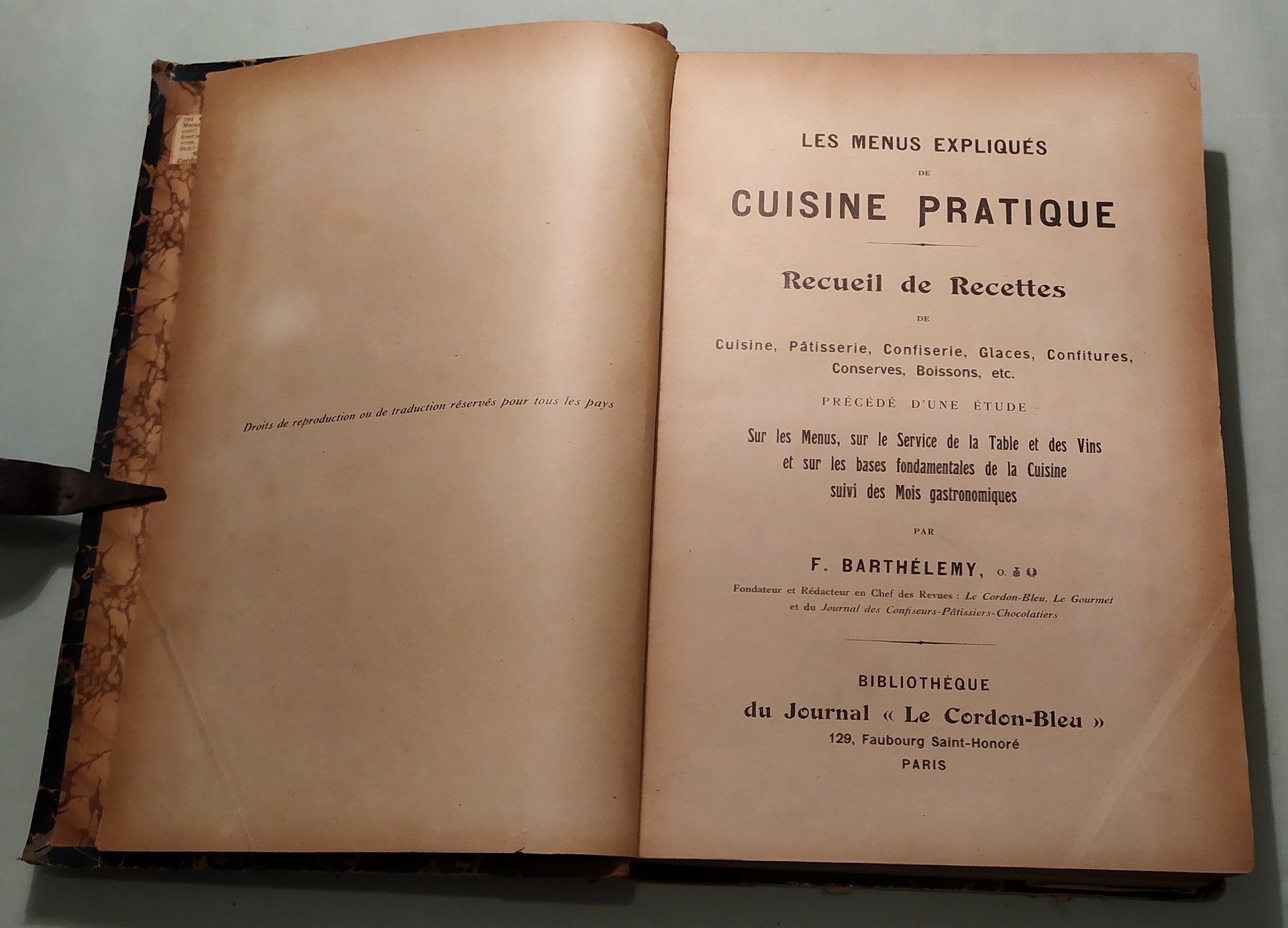 Paris, Biblioteque du Journal Le Cordon Blue, s.a. pp.LXX,218. Unito: Le Cordon Blue. Bonne Annee 1913. pp.284. Unito: Le Cordon Blue. Revue illustree des cours de cuisine. s.a.; pp.384. Le due edizioni del Cordon Blue con numerazione sfalsata, ma entrambe complete. Tre opere in un volume in 8vo (cm.27x20). Illustrazioni. Mezza pelle coeva, dorso a cordoni con titolo in oro, mancanze al dorso.