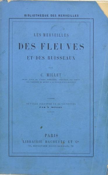 Hachette 1888. In/8, 360 p. + 16 p. de catalogue - 66 vignettes sur bois - 3ème édition. Petit manque à la couverture. Cet ouvrage recherche l’origine des cours d’eau et leur rôle dans l’harmonie générale du globe. Agrémenté de nombreuses illustrations de sites et d’animaux peuplant les cours d’eau.