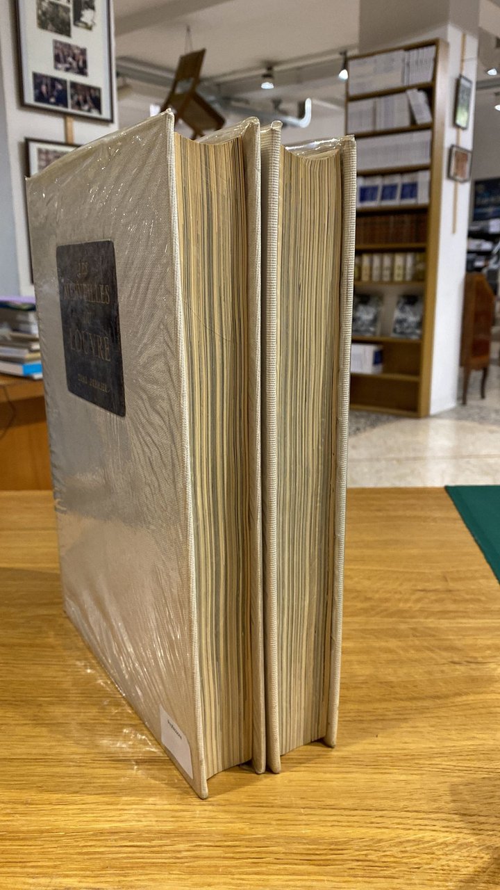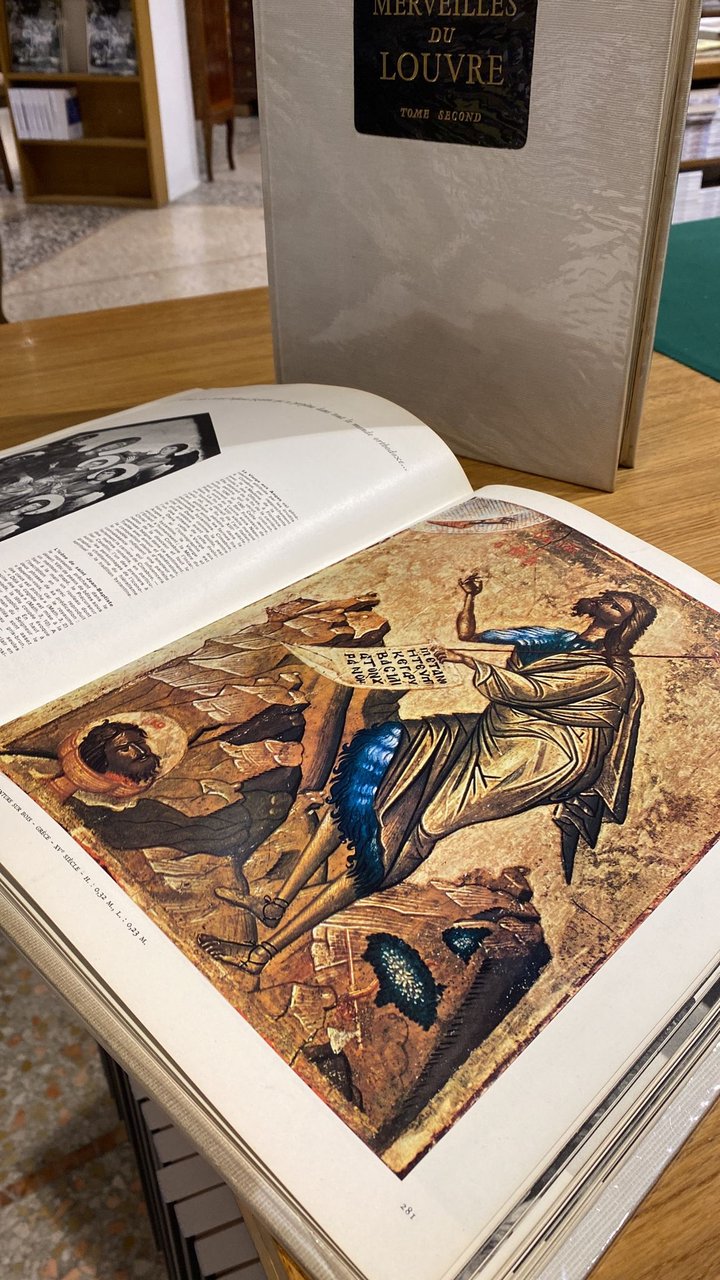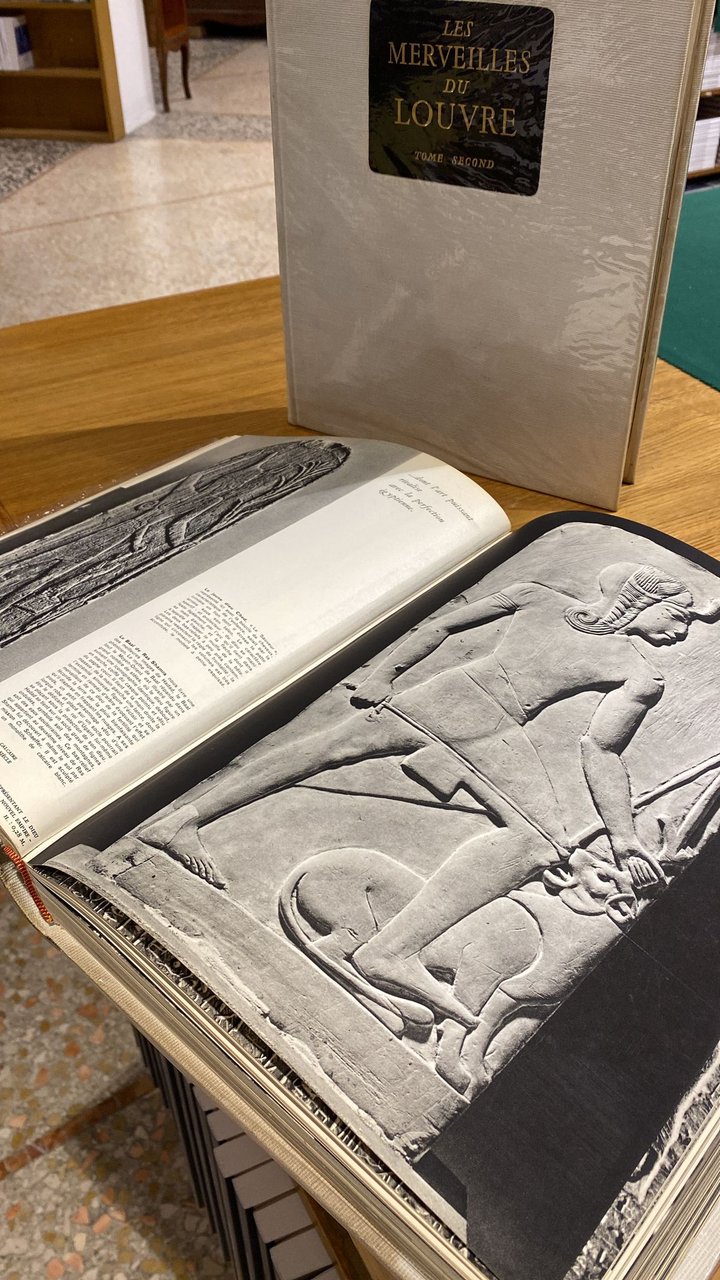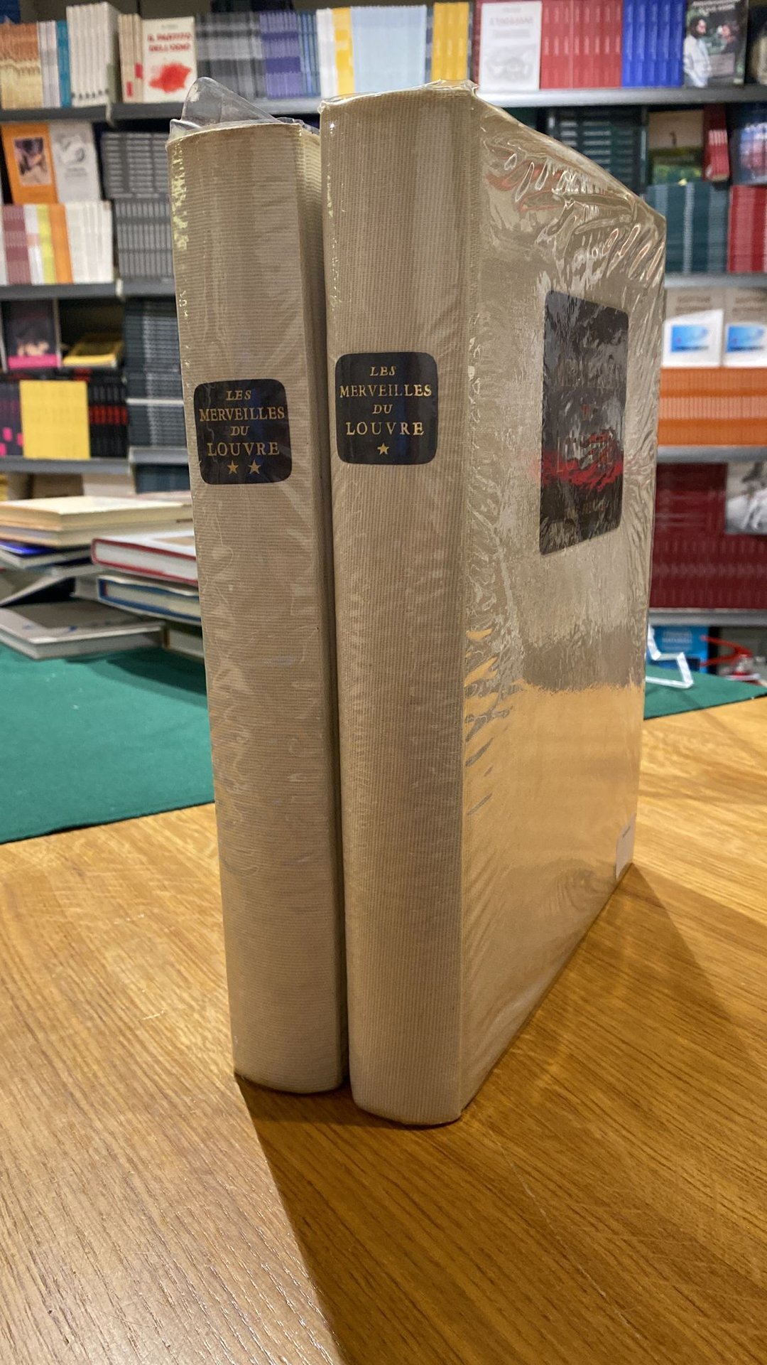 Due volumi stampati nel 1958 sulle opere contenute al Louvre. Il primo volume (341 pp.) tratta opere dal IV millennio aC agli albori del Rinascimento; il secondo volume (341 pp.) tratta le opere dal Rinascimento all'Impressionismo. Copertina rigida in tela grezza con bordi scuriti dal tempo e titoli in oro su etichette nere perfettamente conservati. Il libro è ricoperto da una copertina di plastica protettiva. Ciascun volume presenta al suo interno stampe a colori ed in bianco e nero. Prefazione di Jean Charbonneaux .Lingua Francese.