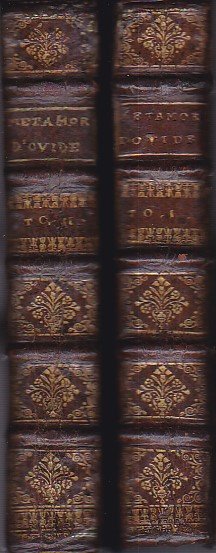 2 voll. in-8° (192x120mm), pp. (14), 602, (6); (8), 631; legatura coeva p. pelle nocciola con ricche impressioni floreali e vegetali in oro, titolo su tassello granata e tomaison egualmente in oro entro scomparti su dorso a nervi. Tagli spruzzati. Sguardie in marmoreggiatura policroma. Antiporta incisa su rame da Ertinger al primo vol. con Ovidio nell'atto di comporre, un putto sorreggente il serto poetico e figure mitologiche sullo sfondo. Frontespizi in rosso e nero con fregi calcografici centrali con un canestro di fiori. 189 incisioni calcografiche a m. pagina con scene mitologiche desunte dal poema ovidiano, disegnate e incise da Ertinger. Fregi floreali intercalati n.t. incisi su rame. Iniziali ornate. Bell'esemplare con dorsi abilmente restaurati e qualche brunitura. Bella e ricercata edizione delle 'Metamorfosi', nella traduzione francese in prosa dell'abate Jean Baptiste Morvan de Bellegarde (Piriac, Nantes, 1648-1734), riccamente illustrata da Ertinger e dedicata a Luigi Augusto di Borbone. Le 'Metamorfosi' hanno fine alla p. 418 del II vol. e sono seguite da 'Le Jugement de Paris' (419-489), 'Les Abeilles' (490-508; traduzione di un episodio del IV libro delle virgiliane 'Georgiche'), 'Epitres choisies d'Ovide' (508-631). Graesse, V, 89. Manca al Cohen-De Ricci.