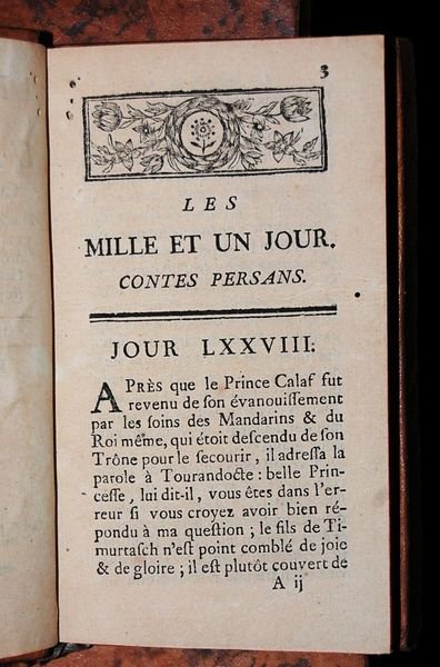 In 12° grande (18×9,1 cm); 5 tomi: 270 pp., 268 pp., 277, (1) pp., 282 pp., 308, (2) pp. Le prime pagine del volme portano spesso numerazione romana. Completo. Le pagine bianche in fondo al volume sono applicate alle bellissime carte marmorizzate di sguardia. Bellissime legature coeve in piena pelle marmorizzata con titolo, numero del volume e ricchissimi fregi in oro al dorso. Qualche lieve difetto. Una leggerissima brunitura al margine esterno bianco delle prime due carte del quarto volume. Tagli rossi. Testatine, finalini ed iniziali ornate. Nuova edizione rara (come tutte le edizioni precedenti) di questa celeberrima traduzione del celebre letterato ed orientalista francese, figlio dellinterprete arabo alla corte di Francia e a sua volta interprete ufficiale della corona, François Petis de la Croix (1653-1713). Inviato per formarsi da Colbert in giovane età in Siria, Persia e la Turchia venne a contatto con numeroso materiale letterario che poi avrebbe ripreso e studiato nel corso di tutta la vita. Dopo un periodo di studio ad Aleppo, arrivò nel 1674 a Isfahan, dove rimase fino al giugno del 1676. Da una breve descrizione di questo suo soggiorno si apprende del suo profondo interesse per i costumi dei dervisci tanto che si crede che de la Croix sia stato uno delle più importanti fonti sul Sufismo nellOccidente del XVII° e XVIII° secolo. Fra lesue opere principali troviamo proprio questa raccolta di favole che molto deve al Sufismo. De la Croix sostenne che lopera fosse la traduzione di un opera dal titolo persiano Hazar u yek Ruz (alla lettera Le mille ed un giorno), che lorientalista acquisì da un Dervish Mocles o Moklas a Isfahan nel 1675. Non è chiaro quanto questo sia vero. Molti sostengono che la gran parte dei racconti è stato effettivamente inventato da Petis de la Croix stesso. Sicuramente allepoca in cui lopera venne pubblicata e per tutto il settecento, il clima di caccia alle streghe verso diverse forme di eresia e dottrine orientali, potrebbe aver suggerito a De la Croix di dare ad altri la paternità dellopera. Il fatto che due altri grandi orientalisti Antoine Galland e Barthélemy dHerbelot de Molainville che frequentavano De la Corix, non abbiano lascito nei loro scritti nessun riferimento importante alle pratiche del Sufismo può suggerire lidea che nonostante largomento sia stato a più riprese trattato nei loro dialoghi, sia stato però ritenuto dagli orientalisti, troppo pericoloso da trattare in forma scritta. Effetivamente alcune pratiche del Sufismo conossciute e descritte da De la Croix erano simili ad alcune pratiche ritenute allepoca come stregoneria e vivamente condannate dallInquisizione. Probabilmente de la Croix cercò di tramandare alcune delle conoscenze che aveva appreso in oriente in forma di racconto fantastico per non incorrere nella censura. Opera in ogni caso assai rara ed ancor più rara a trovarsi completa.