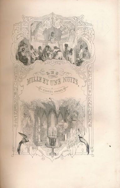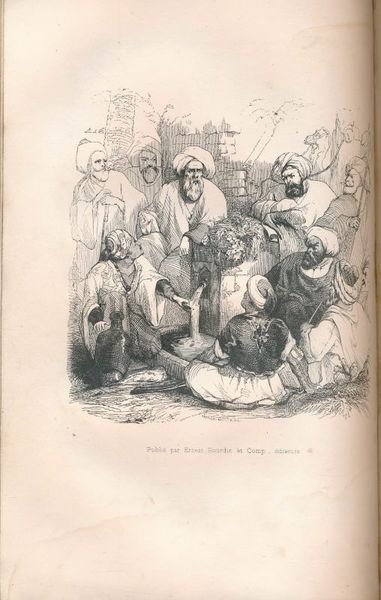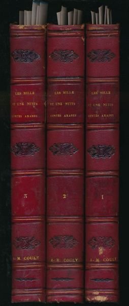 E. Bourdin 1840 Paris, E. Bourdin, sans date vers 1840. 3 volumes grand In-8 reliés demi-chagrin bordeaux, dos à filets dorés et fleurons estampés à froid, titre et tomaison dorés, nom du propriétaire doré en queue. VIII + 482 + 576 + 482 pages. Edition illustrée par les meilleurs artistes français et étrangers, revue et corrigée sur l'édition princeps de 1704, augmentée d'une dissertation sur les Mille et une nuits par M. le Baron Sylvestre de Sacy. Notre exemplaire est imprimé sur vélin fort et comporte 17 gravures hors texte comme le signale Carteret et environ 1000 gravures (III-256), alors que le tirage courant comporte seulement 14 gravures hors texte. Reliure un peu frottée, restauration de la table des matières à la fin du tome III, charnière du tome I fragile et mouillure claire du même tome en partie inférieure en fin de volume, sans rousseurs. Exemplaire de 1er tirage, belle qualité des gravures. Malgré les défauts signalés, reste un bon exemplaire avec la particularité des 17 gravures signalées.