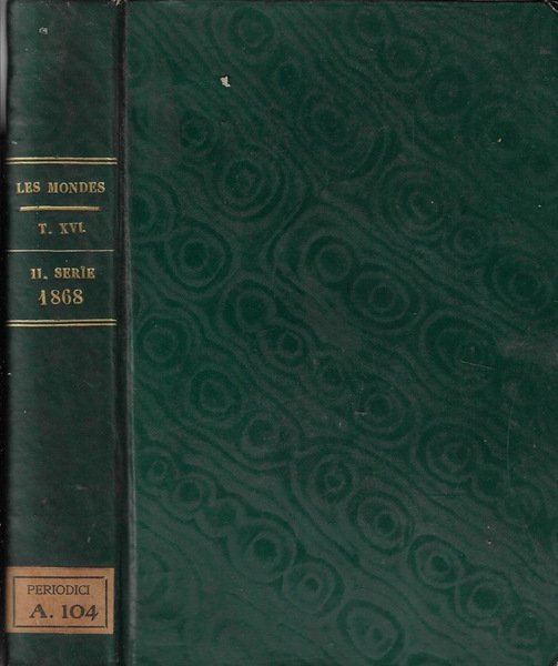 Annata incompleta composta da un volume del periodico in lingua francese "Les mondes" anno 1868 tomo XVI rispettivamente dal mese di gennaio al mese di aprile. Il volume potrebbe contenere timbri ed etichette dell'Istituto Veneto, regolarmente acquisito dalla nostra libreria. Coperta rigida ed ingiallita dal tempo presentante segni di usura ai margini con abrasioni e strappi agli stessi ed alle cuffie e tracce di usura da sfregamento ai piatti; etichetta precedente alla cuffia inferiore del dorso. Pagine fruibili anche se brunite dal tempo, in particolare ai tagli e sporadicamente fiorite. Lieve ondulazione dei fogli dovuta alla naturale umidità dei secoli. Segno a penna alla pagina di guardia. Numero pagine 780.