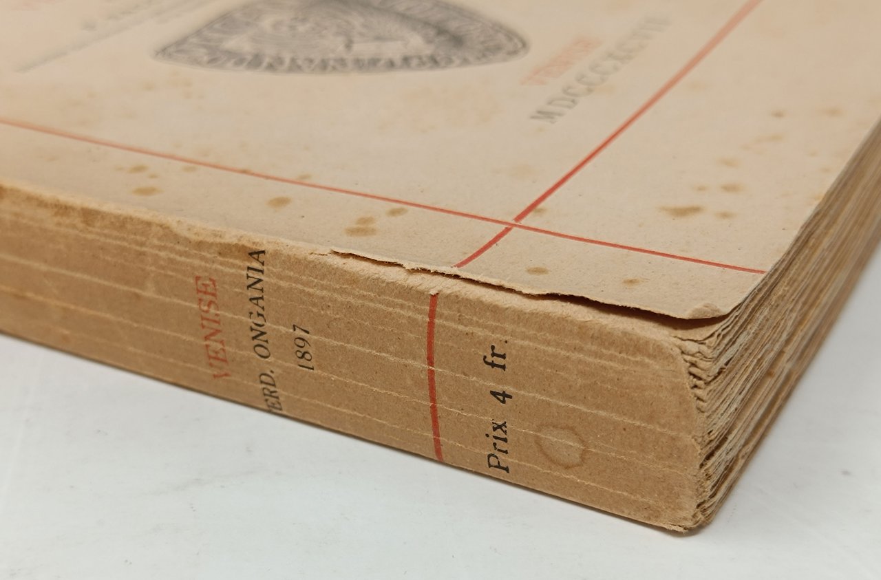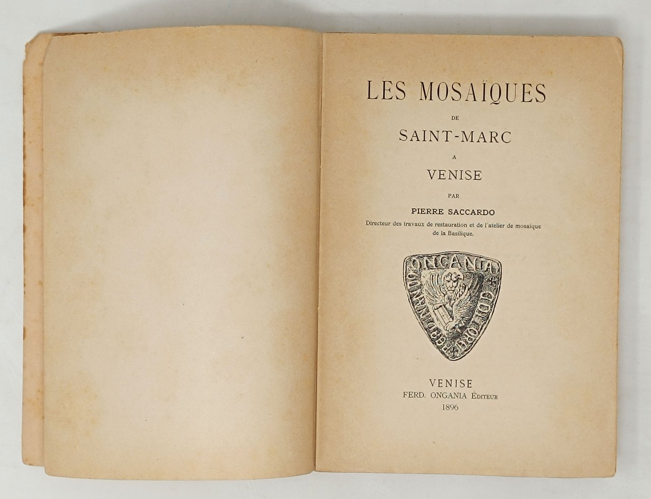 Autore: Pierre Saccardo (directeur des traaux de restauration et de l'atelier de mosaique de la Basilique). Venise, Ferd. Ongania éditeur, 1896 (ance se sulla copertina anteriore è stampato MDCCCXCVII). Formato: 14 x 20 cm circa. Pagine: 336. Lingua del testo: francese. Stato di conservazione: un taglio di circa 4 cm (senza mancanza) sul margine inferiore della copertina anteriore in corrispondenza con la linea di attaccatura al dorso, ingiallimenti, un timbro (probabilmente di un ex proprietario) sulla prima pagina bianca ma, nel complesso, un buon esemplare. Interno ancora intonso. Importante studio sui mosaici della Chiesa di san Marco in Venezia, trattato non solo dal punto di vista storico ma dando peso anche alle questioni artistice, e a quelle relative all'iconografia sacra. Sono riportati altresì i nomi dei mosaicisti e dei pittori oltrechè le date e le descrizioni dei soggetti.