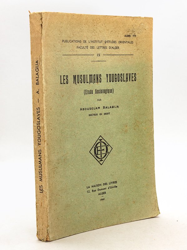 1 vol. in-8 br., Publications de l'Institut d'Etudes Orientales, Faculté des Lettres d'Alger, La Maison des Livres, Alger, 1940, 151 pp. Bon état (couv. lég. frottée)