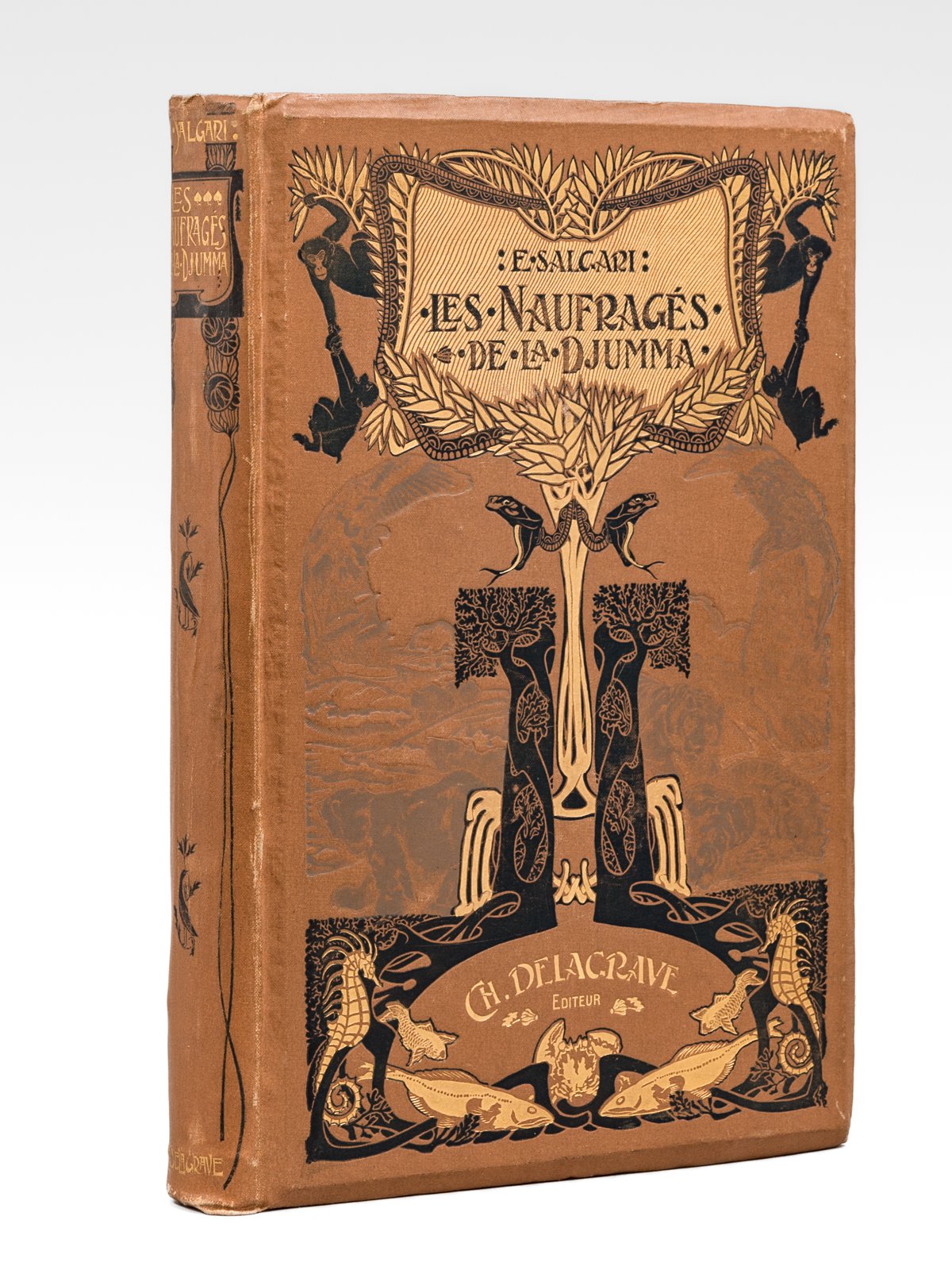 Illustrations de E. Trigoulet, traduction de J. Fargeau, 1 vol. grand in-8 cartonnage éditeur pleine percaline brune, coupes biseautées, toutes tranches dorées, Librairie de Ch. Delagrave, Paris, s.d. [ circa 1902 ], 297 pp. et 2 ff. n. ch. Beau cartonnage richement orné (poissons, hippocampes, singes et serpents, arbres et ossements). L'histoire se déroule dans le Golfe du Bengale et les naufragés se retrouvent isolés dans le mystérieuses et sauvages îles Andaman. Le romancier itEmilio Salgari (1862-1911) Bon état.