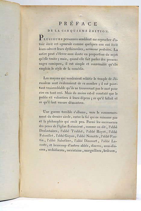 32 pages. (19,5x12,5 Cm). Broché. Couverture muette. Curieux poème satirique, imprimé par Fournier, dans lequel Marie-Joseph de Chénier se moque de la médiocrité de certains écrivains anti-philosophiques. Ce petit ouvrage eut cinq éditions en deux mois; ce qui prouve que les rieurs étaient aussi nombreux que les prêcheurs. Petites taches d’encre sur la page de titre. Rares rousseurs.