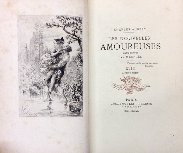 In-16 gr. (mm. 180x110), 2 volumi, mz. pelle coeva, dorso a cordoni con titolo oro, tagli super. dorati, conserv. le belle brossure orig. a colori. Vi sono contenuti 10 racconti, di 62/64 pp., ciascuno illustrato da un delizioso disegno in tinta e da 1 bella tav. all'antiporta di carattere galante, inc. all'acquaforte da Jul. Hanriot e Mesplès: Vol. I - Grésillon et Gringuenaude (XIII) - Ma tante Irène (XIV) - Le Prince (XVI) - La Jarretière (XVII) - L'innocent (XVIII).Vol. II - L'innocent (XVIII) (questo racconto è stato inserito due volte) - Le ballon rouge + Le fruit défendu (XIX) - Les derniers brigands (XX) - Varvara + Natacha (XXI) - Sacha et Ludmilla + Marfa (XXII).Solo qualche lieve fiorit. alle tavole, altrimenti esemplare ben conservato.