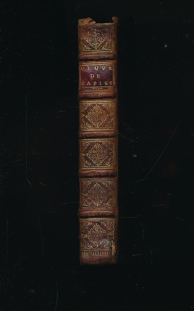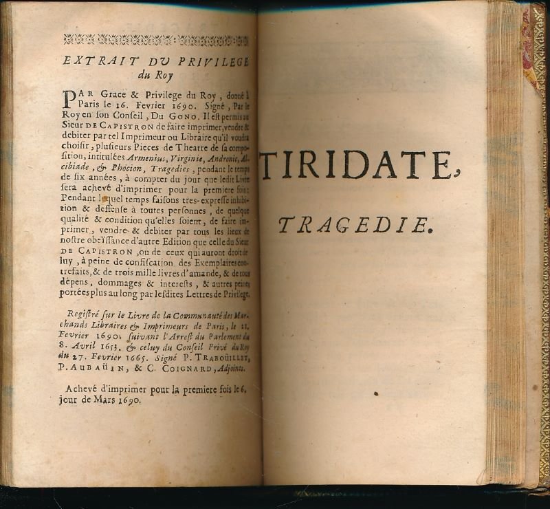 Chez Thomas Guillain 1690 MOI A Paris, Chez Thomas Guillain, 1690. In-12 relié pleine basane de l'époque, dos à nerfs orné de fleurons dorés, pièce de titre maroquin rouge,. Roulette intérieure et sur les coupes. Tranches dorées. Peitt manque à la coiffe et en queue. 1 feuillet blanc, frontispice, faux titre, titre. 379 pages + RELIE A LA SUITE : Tiridate tragédiee : Titre, 3 feuillets non chiffrés + 77 pages + 1 feuillet blanc. (Le privilège pour ce titre est de 1691). Arminius, Virginie, Andronic, Alcibiade, Phocion. Tiridate.