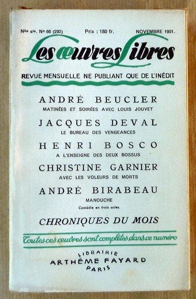 Une revue littéraire brochée de 320 pp. Textes inédits de A. Beucler; J. Deval; Henri Bosco ("A l'enseigne des deux bossus"); C. Garnier; A. Birabeau. Bel état. Voir photo.