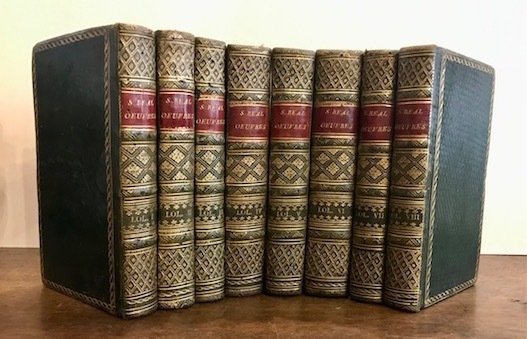 16mo (cm. 14), 8 Voll., 2 cc.nn., XXXI-332 pp., 2 cc.nn.; 2 cc.nn., 342 pp.; 2 cc.nn., 311(1) pp.; 2 cc.nn., 479(1) pp.; 2 cc.nn., 413(1) pp.; 4 cc.nn., 503(1) pp.2 cc.nn., 346 pp.; 4 cc.nn., 354 pp., 2 cc.nn. Belle legature coeve in marocchino verde con piccoli nervi, ricchi fregi e titolo oro su tassello al ds. Cornici dorate ai piatti. Tagli rossi. Carte di guardia marmorizzate. Alcuni forellini di tarlo ai dorsi e qualche lieve brunitura interna, peraltro esemplare in ottimo stato di conservazione.