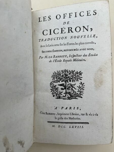 Barbou 1768 Paris, Barbou, 1768. In-12 relié plein veau de l'époque, dos à nerfs trés orné. XVI + 464 pages. Traduction nouvelle, avec le Latin revu sur les textes les plus corrects. Mors fragiles, petit manque de cuir en tête et en queue, intérieur en trés bon état. Bon exemplaire.