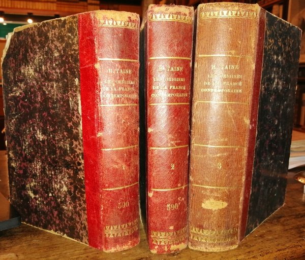In-8 (21 cm) 3 voll (4) III (1) 467 (1); (4) II 486(2); (4) IV 646. Occhietto con titolo: "Les origines de la France Contemporaine". Mezza pelle rossa, piatti in carta marmorizzata. Un piatto del secondo volume è privo degli angoli. Poche fioriture.Hippolyte Adolphe Taine (1828-1893) è stato un filosofo, storico e critico letterario francese. È stato il principale teorico del naturalismo francese, uno dei principali fautori del positivismo sociologico, e uno dei primi operatori di Critica storicistica. Egli diede quindi origine al movimento dello storicismo letterario. French language. Lingua francese