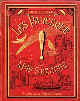 In-8° (255x215mm), pp. (4), 295, bella legatura editoriale in t. tela rossa figurata con, al piatto, titolo, filetti ed impressioni in nero ed in oro effigianti scene del romanzo. Fregi ornamentali in nero e in oro al dorso e decori arabescati e vegetali in nero al centro e agli angoli del piatto posteriore. Tagli dorati. Numerose e belle illustrazioni silografiche n.t. e f.t. (una all'antiporta) di Benett, Gosselin, Gobin, Monginot, Vogel, Zier, Ferdinandus, incise da F. Méaulle. Prima edizione, ottimamente conservata (salvo lievi fioriture) di questo graziosissimo volume che, attraverso le avventure della protagonista, tenta di divulgare numerose curiosità tecniche, scientifiche e geografiche. Il Desbeaux, nato a Parigi nel 1845, fu letterato, giornalista e drammaturgo, segretario generale del Théatre de l'Odéon. Embs-Mellot, 'Le siècle d'or du livre d'enfants et de jeunesse. 1840-1940', p. 132: 'Comme les enfants pouvaient s'interroger sur des sujets aussi divers que la fabrication du pain, du gaz de l'éclairage ou du papier, Emile Desbeaux devancera leurs questions avec les 'Idées de mademoiselle Marianne' (Ducrocq, 1884). Dans cette jolie série, ce patient éducateur répondra aux questions, corrigera les a priori de l'enfance et provoquera ses réflexions avec 'Les Pourquoi et les Parce que de mademoiselle Suzanne'. Vapereau, p. 454.