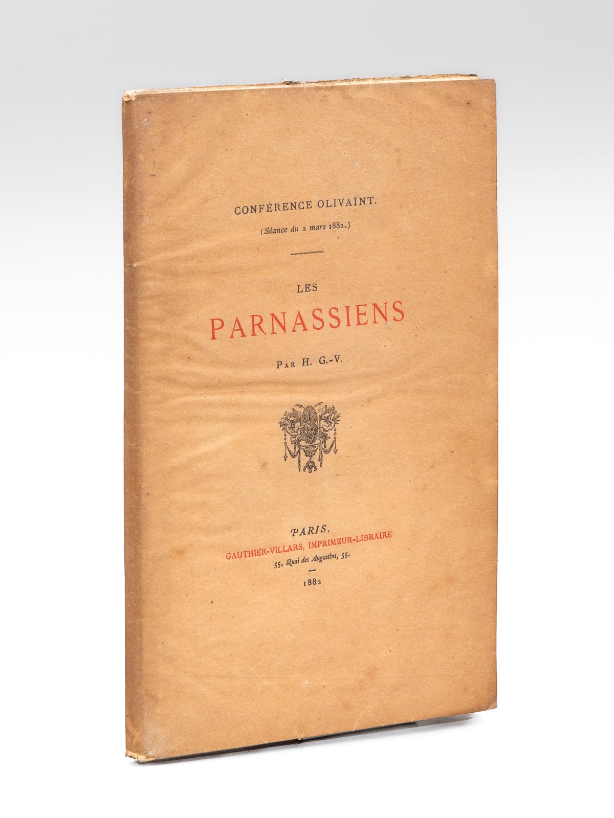 1 brochure in-8, Conférence Olivaint, séance du 2 mars 1882, Gauthier-Villars, Imprimeur-Libraire, 1882, 54 p. Rare et belle impression sur beau papier vergé, publiée sous pseudonyme et dédicacée par le célèbre auteur Henry Gauthier-Villars dit Willy : « Hommage de l'humble, très humble auteur. A Monsieur R. Declozière sous-lieutenant d'artillerie au Mans » daté du « 17/2/1883 ». Un article de la Revue 'Les Marges' évoque cette plaquette à Willy : 'Ils font suite à un discours fort ancien de Willy qui, le 2 mars 1882, parla à la Conférence Olivaint sur les Parnassiens. Cette conférence où les Parnassiens et particulièrement Théodore de Banville, Leconte de Lisle, Catulle Mendès étaient fort malmenés parut la même année en une mince plaquette : 'Les Parnassiens' par H. G. V., Paris, Gauthier-Villars, 1882' (Les Marges, Tome XIV, n°51, 145). Très rare exemplaire dédicacé de la première publication du célèbre mari de Colette ! Willy (1859-1931) n'avait alors que 22 ans. Bon état.