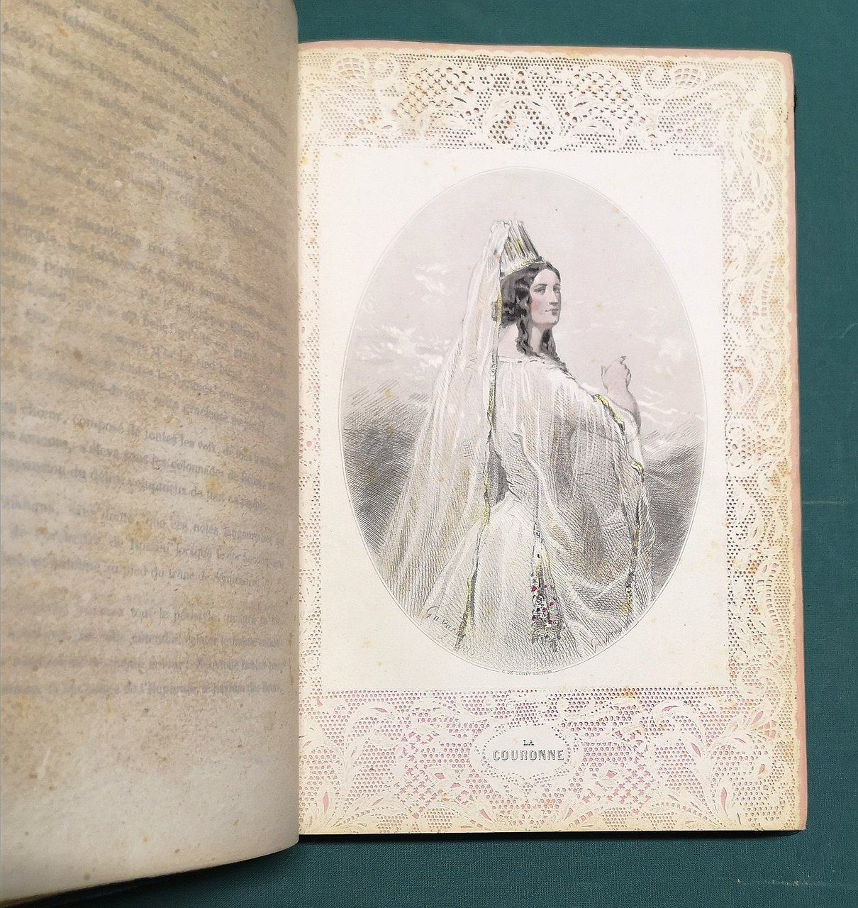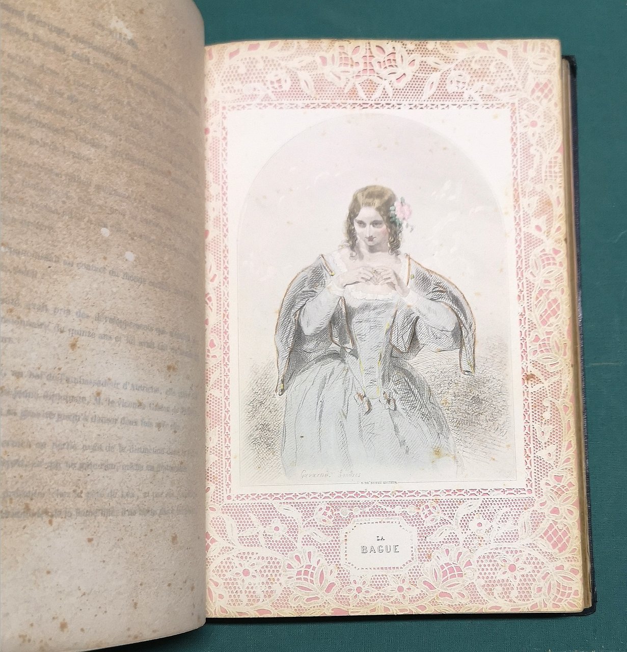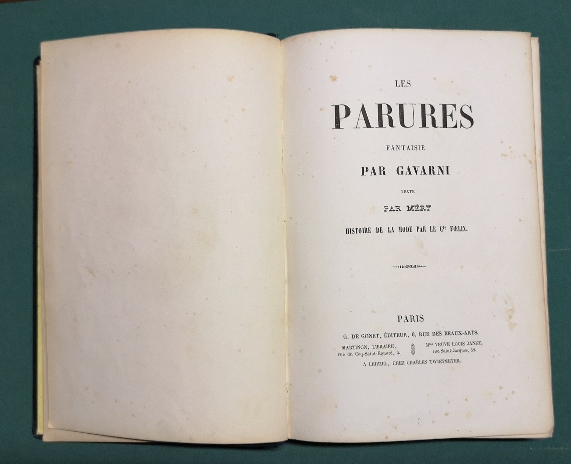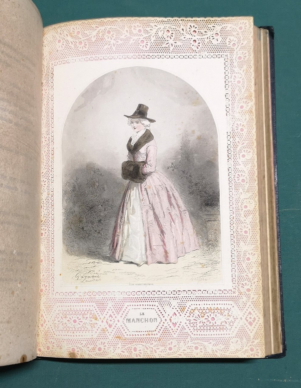 >2 parti in un vol. in-8 gr., pp. (4), 300, leg. edit. t. tela decorata, tagli dor. (difetti ad una cerniera). Antiporta e 15 tavole f.t. inc. a lievi colori su acciaio da Geoffroy dai disegni di Gavarni, raffig. eleganti giovani signore ben acconciate ed in abiti raffinati, ciascuna incorniciata da pizzo e protetta da velina. La parte seconda inizia a pag. 201 e reca il sottotitoo ''Histoire de la mode''. Esemplare ''sur vélin avec les marges des planches découpées en dentelle''. Buon esemplare, sporadiche bruniture. Colas I, 2041. Brivois 318. Lipperheide 573. Vicaire V, 770.
