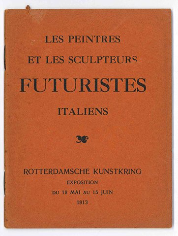 LIBROEdizione originale.Ottimo esemplare, appena rugginoso alla pinzatura e con una piccola gora sul piatto anteriore; proveniente dalla collezione di Luce Marinetti, ultima delle figlie del capo del futurismo, come da timbro ex libris.Non comune e prezioso catalogo della mostra olandese della primavera del 1913, organizzata dal Circolo cittadino. Si tratta della prima mostra tout court dove appaiono delle sculture futuriste (e sono la «Compenetrazione di testa, finestra» etc. e lo «Sviluppo di una bottiglia nello spazio», entrambe opere boccioniane). Realizzato sulla falsariga di quello per la «Prima esposizione pittura futurista» Roma febbraio 1913 (Teatro Costanzi / Gall. G. Giosi), di cui traduce il testo «Les exposants au public» (a sua volta minimo aggiornamento del testo introduttivo realizzato per la tournée del 1912 — Pacini segnala le varianti tra i due testi francesi), il catalogo di Rotterdam ne è un perfezionamento: Soffici entra a pieno diritto nel gruppo, anche come firmatario del testo; in catalogo figurano un elenco dei quadri venduti durante la tournée 1912, con relativi compratori (Marinetti, Borchardt, Busoni, Bernheim Jeune, Rothschild, Meyer-See); i prezzi (o il prestatore) delle nuove opere presentate (il più costoso è il «Dynamisme musical» di Russolo, seguito a stretto giro da quadri di Boccioni e Carrà); la nuova sezione dedicata alla scultura; 6 clichées originali delle opere esposte (Boccioni, Elasticité; Carrà, Forces centrifugues; Russolo, Résumé plastiques des mouvements d’une femme; Balla, Une laisse en mouvement; Severini, Hiéroglyphe dynamique du Bal Tabarin; Soffici, Synthèse picturale de la ville de Prato). Tra le altre varianti rispetto alla mostra romana, due quadri di Russolo (Moi mouvementé, Résumé plastique des mouvements d’une femme). La copertina del catalogo, invece, riprende colore e impaginazione del ‘mitico’ catalogo Parigi feb. 1912, ovvero poi della tappa Bruxelles mai-juin 1912, con i quali viene facile a prima vista confonderlo.«Nella nuova formazione a sei sperimentata all’inizio del 1913 a Roma [Galleria Giosi], estesa con Boccioni anche alla scultura, gli artisti futuristi si ripropongono in Europa [.]. In catalogo [.] si esibisce un elenco dei dipinti [con prezzi e] venduti» (NAF)Pacini, Esposizioni futuriste 1912-1918, p. 31-s; Nuovi archivi del futurismo I, 1913/4