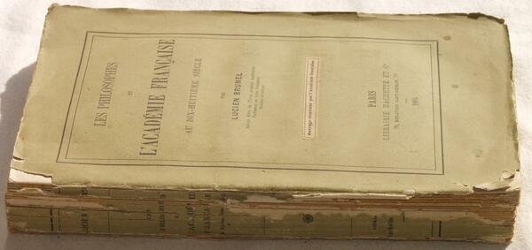 In 8. Dim. 23x14,5 cm. Pp. XVI+371. Prima edizione del 1884 di questa interessante opera sui filosofi dell'Accademia francese nel XVIII secolo scritto da Lucien Brunel. L'autore analizza diversi filosofi: Duclos, D'Alembert, Lefranc de Pompignan, Voltaire, Marmontel, Geoffrin, Meme du Deffand, Mlle de Lespinasse, Mme Necker, Gaillard, l'abbè Arnaud. Completo, alto valore. BRossura editoriale in discrete condizioni generali con usure e parti mancanti ai margini; dorso con rotture; piatto anteriore staccato. Legatura in discrete condizioni con rotture. All'interno le pagine si presentano in buone condizioni con fioriture. First edition of 1884 of this interesting work about the philosopher of the French Academy in the XVIII century written by Lucien Brunel. The author analyzes different phylosophers: Duclos, D'Alembert, Lefranc de Pompignan, Voltaire, Marmontel, Geoffrin, Meme du Deffand, Mlle de Lespinasse, Mme Necker, Gaillard, l'abbè Arnaud. Complete work, high value. Editorial cover in fair general conditions with wearings and missing parts in the edges; spine with cracks; front plate detached. Binding in fair conditions with cracks. Inside pages are in good conditions with foxings.