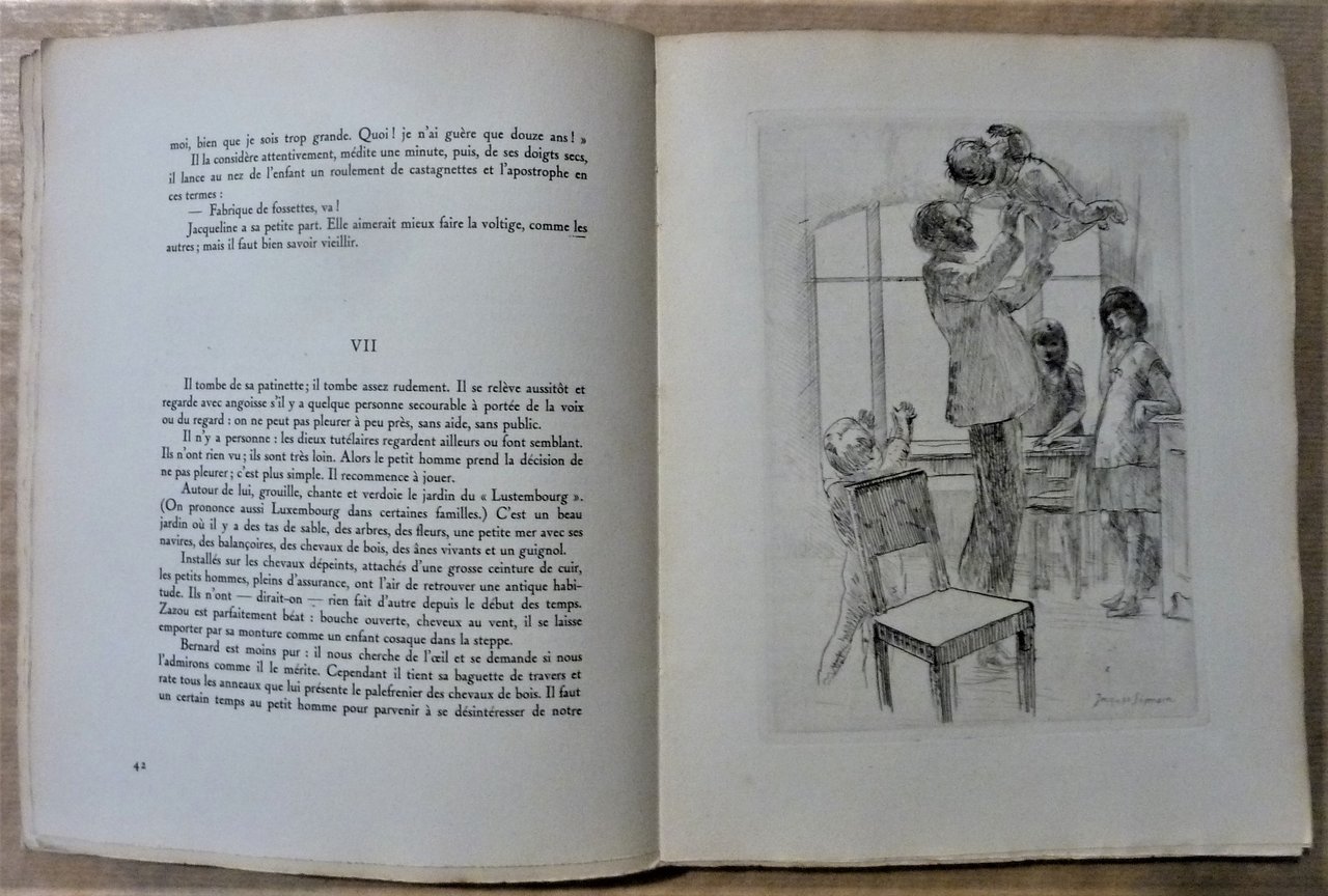 Un volume broché de format in 8° carré de 184 pp.; illustré de vingt eaux-fortes originales dans le texte mais en pleine page de Jacques Simon. Exemplaire N°325/580 sur vélin avec un état des eaux-fortes. Couverture légèrement défraîchie; intérieur très frais. Voir les photos. Ouvrage peu fréquent de l'auteur d'un des plus intéressant témoignages sur la Bataille de La Somme par l'intermédiaire de sa correspondance à ses enfants. De ses enfants justement il en est question de manière touchante dans ce livre, ainsi que de la fonction de père.
