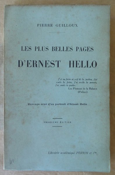 Un volume broché de format in 8° de 234 pp.; portrait d'Ernest Hello en frontispice. Couverture roussie, dos bruni; rousseur sur certaines pages; non coupé. Sinon assez bon état. Voir photo.