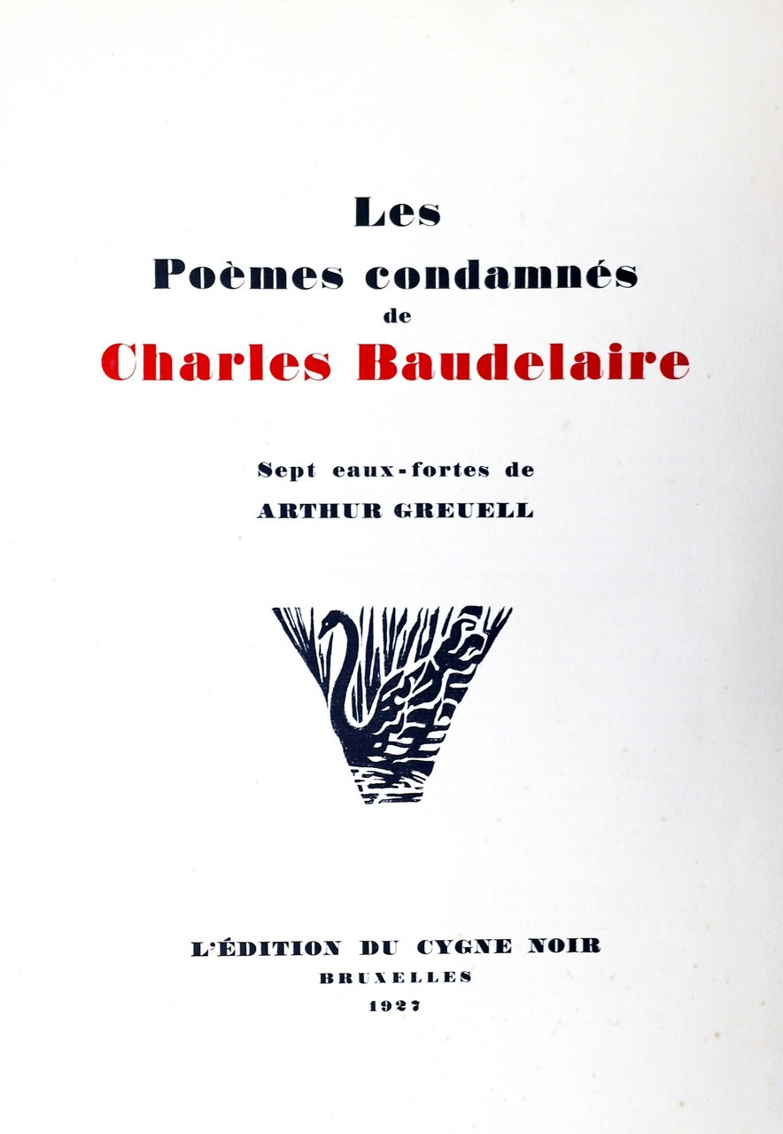 In folio (mm. 381x280), cartella edit. in brossura orig. con titolo e illustrazione in argento di Arthur Greuell, contenente, a fogli sciolti, pp. (4),45,(7) + 4 di presentazione dell'edizione, ornati da disegni e titoli in rosso nel testo Vi sono riprodotti sei poemi di Charles Baudelaire, contenuti nella prima edizione dei Fleurs du Mal del 1857, soppressi in seguito dalla censura, e da allora conosciuti col titolo simbolico di Poèmes condamnés. Introdotti da un Epigraphe pour un livre condamné, vi figurano: Les Bijoux - Le Léthé - A celle qui est trop gaie - Lesbos - Femmes damnées - Les Métamorphoses du Vampire. Li illustra, con 7 pregevoli acqueforti, firmate in calce, e protette da velina con didascalia in rosso, l'artista belga Arthur Greuell (1891-1966).Questa bella edizione (primo volume pubblicato sotto la marca del Cigne Noir a Bruxelles), è stata tirata in 106 esemplari sur papier le hollande de Pannekoek. Il ns., sous la lettre A - au nom de M. Arthur Greuell, fa parte dei six exemplaires de collaborateurs, lettrés de A à F, ed è molto ben conservato.