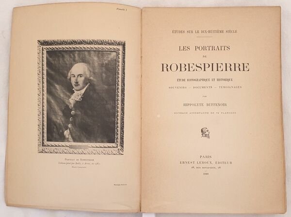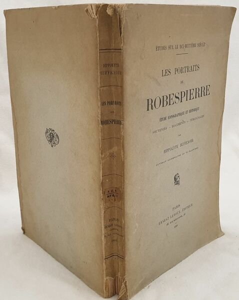 Prima edizione del 1910 di questo interessante studio sui ritratti di Robespierre scritto da Hippolyte Buffenoir (1847-1928) originario del Burgundy. Buffenoir scrisse molto di Rousseau e lavorò per molte riviste. Studio iconografico e storico. All'interno sono presenti 72 planches fuori testo che mostrano rappresentazioni del politico e rivoluzionario francese in varia forma dalle statue alle medaglie ai quadri alle incisioni. In buone condizioni. Copertina editoriale in buone condizioni con usure marginali e piccole parti mancanti. Piccola gora al margine destro. Legatura in buone condizioni con qualche lieve rottura. Pagine in ottime condizioni con rare fioriture. In 4. cm 28x19,5. Pp. VIII+222. Peso Kg. 1,350 First edition of 1910 of this interesting study about the portraits of Robespierre written by Hippolyte Buffenoir (1847-1928) from Burgundy. Buffenoir wrote a lot of Rousseau and worked for many magazines. Iconographic and hystorical study. Inside there are 72 out of text plates featuring images of the revolutionary politician from statues to medals to paintings to engravings. In good conditions. Editorial cover in good conditions lightly worn with lackingsin the extremities. Little stains in the edges. Binding in good conditions with some light crack. Pages in very good conditions with occasional foxing. In 4. cm 28x19,5. Pp. VIII+222