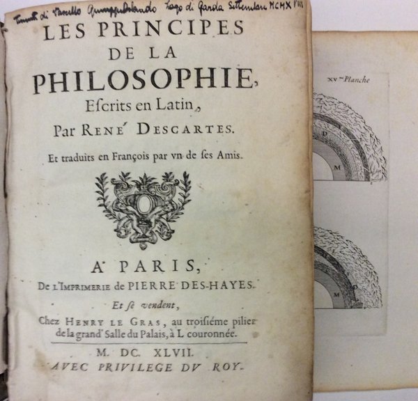 In-8 p. (mm. 205x150), p. pergamena coeva, titolo ms. al dorso, cc.nn. 30, 1 antiporta incisa, pp.num. 420 (ma 486), 1 c.nn., illustrato da 20 tavole fuori testo (come da Indice), ciasc. con più figure, inc. in rame e ripieg., poste al fine. Al ns. esemplare manca l'antiporta datata M.DC.XLVII (rarissima a trovarsi): la ns. porta la stessa antiporta incisa ma con la data in numero romano parzialm. cancellata e con stampato 1651 (M.DC.1651), particolarità comune a molti esemplari.Al verso della c.nn. 30 con l'errata, les principales fautes de l'impression sono state effettivamente corrette a mano nel testo."Edizione originale francese" dell'opera fondamentale di Descartes, Principia philosophiae, nella traduzione di Claude Picot, rivista dallo stesso A.; nelle pagine preliminari è stata aggiunta limportante lettera di Descartes al suo traduttore, che serve da prefazione all'opera: La version que vous avez pris la peine de faire de mes Principes est si nette et si accomplie, qu'elle me fait espérer qu'ils seront lus par plus de personnes en François qu'en latin et qu'ils seront mieux entendus. I Principia philosophiae furono pubblicati in latino nel 1644; si articolano in 4 parti: nella prima si trattano i problemi della conoscenza umana, mentre le altre tre contengono le questioni generali del sapere scientifico, cioè la fisica, la struttura dell'universo, la natura di questa terra e dei corpi e sostanze che la compongono. Il testo dei Principia era sostanzialmente già pronto quando fu pubblicato il Discorso sul metodo (1637) ma, visto quanto era successo a Galileo per aver pubblicizzato le concezioni copernicane, Descartes lo tenne in sospeso per parecchi anni e lo pubblicò solo dopo avere elaborato una descrizione dei moti celesti non in evidente contrasto con le idee tradizionali.Cfr. Cioranescu,II,23951 - Brunet,II,611: Première édition de cet ouvrage qui a été souvent réimprimé (en 1651, 1658, ecc.).Nel ns. esemplare: prima pag. di risg. con mancanze e antiche firme di apparten. mss., l'ultima ripetuta anche al frontesp.; leggerm. corto del marg. super.; la p. 151 annerita per lo più al marg. bianco per una sbavatura di stampa; qualche lieve uniforme arross. o alone margin. ma mediamente ben conservato.