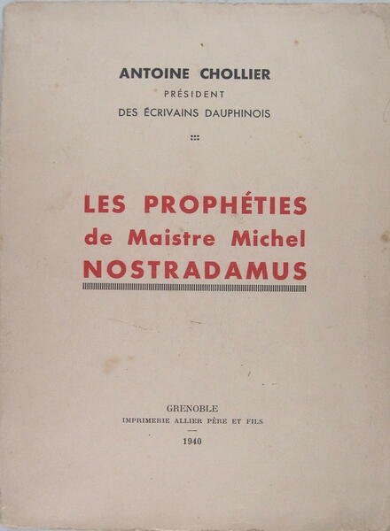 Grenoble 1940, in/8 broché, 54 pages. Conférence faite par Antoine Chollier en 1939 sur les Les prophéties de Maistre Michel Nostradamus.