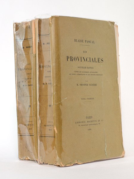 2 vol. forts in-8 br., Librairie Hachette et Cie, Paris, 1886 et 1895, CLXIV-435 pp. et 610 pp. Etat satisfaisant (couv. décrochées, plats partiell. manquants, bon état intérieur par ailleurs) pour ces deux volumes qui peuvent constituer un très bon exemplaire de travail. Prosper Faugère (1810-1887) fut notamment directeur des Archives du Quai d'Orsay. Ce grand spécialiste de Blaise Pascal est resté comme l'éditeur d'une grande édition des Pensées en 1844, puis des la présente édition des Provinciales, achevée peu avant sa mort. L'ensemble de ses archives personnelles concernant Blaise Pascal ont été léguées par sa veuve à la Bibliothèque Mazarine.