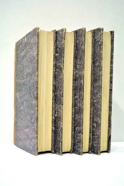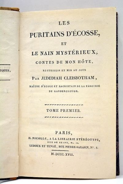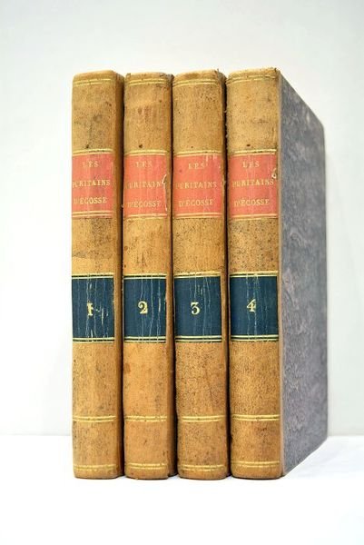 4 volumes in-12. 2 feuillets. 253 pages. + 2 feuillets. 240 pages. + 2 feuillets. 239 pages. + 2 feuillets. 258 pages. (17,5x11cm). Demi-basane blonde de l'époque. Dos lisse avec pièces de titre et de tomaison de maroquin vert et rouge. Plats recouverts de papier à la colle. Tranches jaunes. Reliure un peu frottée. Quelques menus défauts. Premières éditions françaises de ces deux romans. Paru sous un faux nom, en Grande Bretagne comme en France, l'ouvrage fut référencé avec "Cleisbotham" comme auteur par la Bibliographie de France. Il s'agit de la première traduction de Auguste-Jean-Baptiste Defauconpret. L'ouvrage marque le début de la célébrité de Scott en France. "The first considerable success" (Dargan). "Defauconpret's Les Puritains d'Ecosse gave Scott his first French success and first major European breakthrough. Although partially obscured by Ivanhoe and Quentin Durward, it remained for many Frenchmen the Scott novel par excellence. Stendhal is among many to call Scott not 'the author of Waverly' but 'the author of Old Mortality' Often critical of Scott, Stendhal remained an unswerving admirer of Old Mortality" (Barnaby). Balzac y fait également souvent référence dans la Comédie Humaine. Au vu du succès remporté par l'oeuvre, Nicolle engagea Defauconpret à traduire les romans suivants au fur et à mesure de leurs parutions. Ouvrage très rare si l'on considère à quel point il fut populaire en France et l'influence qu'il put avoir dans les milieux littéraires de ce pays. Bon exemplaire dans une jolie reliure de l'époque, quasi sans rousseurs.