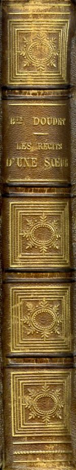 In-4° piccolo, pp. (6), 309, (4), legatura del tempo m. pelle marrone con dorso a nervetti recante un titolo in oro e, entro ognuno degli scomparti, cinque ordini di filetti rettangolati inquadranti un fregio centrale, il tutto impresso in oro. Piatti in percallina marrone con duplice cornice a secco. Tagli dorati. 12 tavv. incise su acciaio f.t. da invenzione di Desandre, di cui una all'antiporta, e frontespizio in rosso e nero con piccola vignetta incisa. Firma dell'editore al verso del foglio di occhietto. Bell'esemplare con usuali fioriture della carta. Edizione originale, priva di anno di stampa, ma databile al 1885-1890 ca., di questa raccolta di racconti di Benjamin Doudet, alcuni dei quali ispirati a leggende e racconti popolari baschi, orientali, bretoni e russi. Elegantemente stampato e adorno di grazioso incisioni.
