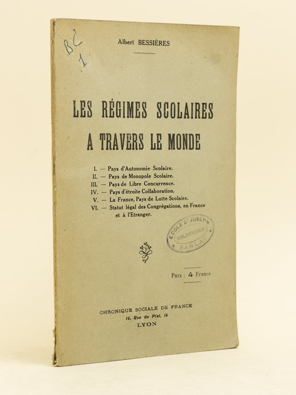 1 vol. in-8 br., Chronique Sociale de France, Lyon, 1927, 56 pp. : Pays d'Autonomie scolaire, Pays de Monopole scolaire, Pays de Libre concurence, Pays d'étroite collaboration, La France, Pays de Lutte Scolaire, Statut légal des Congrégations, en France et à l'Etranger Etat très satisfaisant (anciens cachets d'institution religieuse)