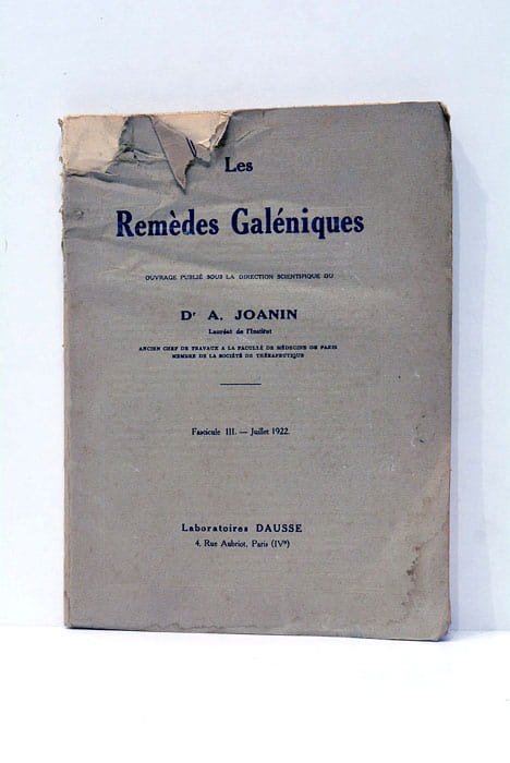 Fascicule III seul. 428 pages en total (140 pages dans cet exemplaire). Illustrations dans texte. (23x17cm). Broché. Couverture imprimée légèrement brunie ate avec signes de mouillures et taches éparses. Déchires marginales. Dos et coins émoussés. Publié à Paris en 1922, cet ouvrage de A. Joanin constitue le troisième fascicule d'une série dédiée aux remèdes galéniques, illustrant l'intérêt persistant pour les pratiques médicinales antiques dans le contexte post-première Guerre mondiale. À une époque marquée par des avancées scientifiques rapides et parfois déstabilisantes, le retour aux méthodes éprouvées de Galien offre un ancrage rassurant. Ce fascicule, tout en s'inscrivant dans une tradition longue de la pharmacopée, témoigne de la quête continue de l'efficacité thérapeutique et de la sécurité des traitements. Premières 288 pages manquantes. Papier légèrement brunie avce taches éparses sans gravité. Premières pages déchirées. Exemplaire partaillemen non-coupé. Illustrations dans texte Fascicule III seul.
