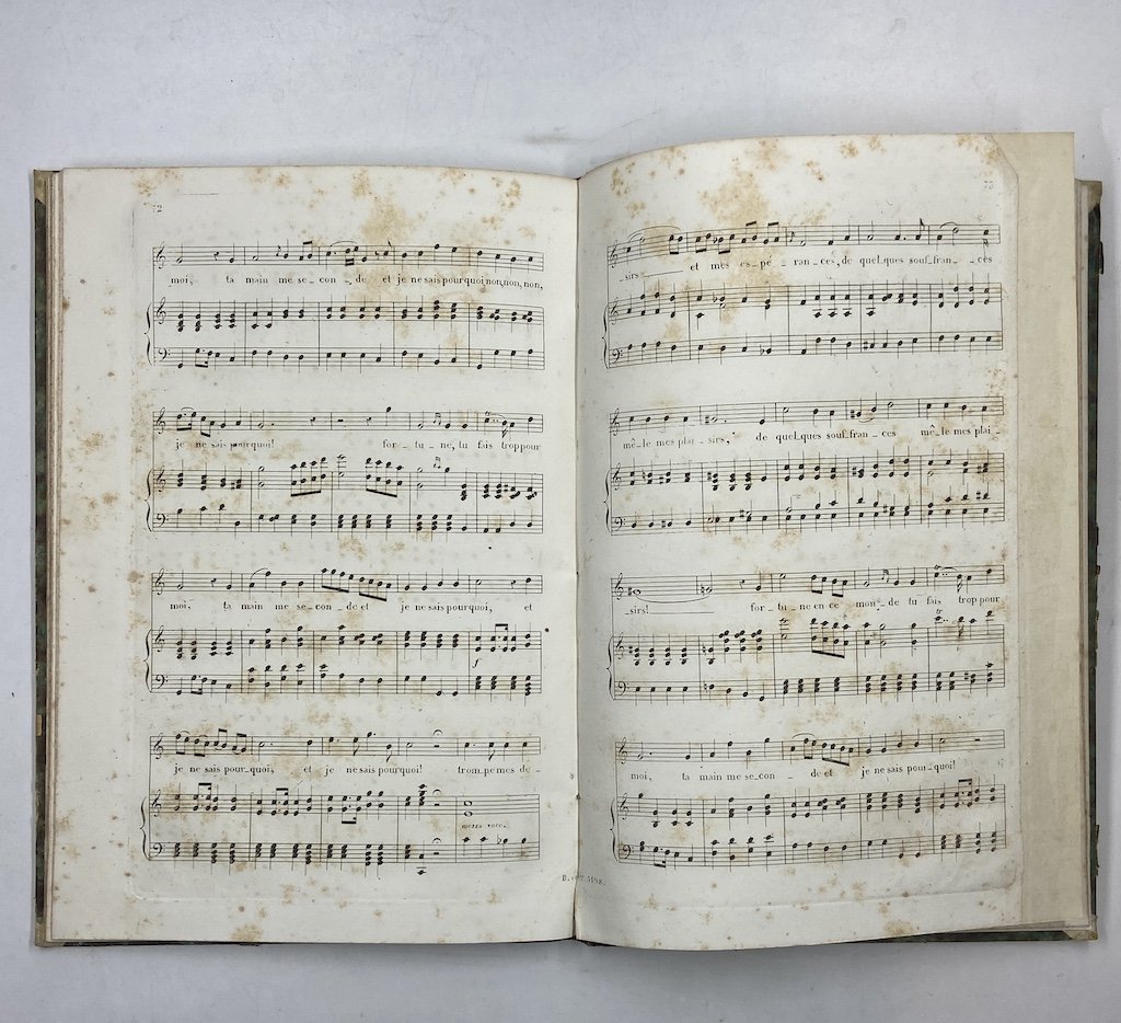 - Esemplare da studio, diffuse e talvolta marcate fioriture, talvolta il bordo d’impressione della lastra con la partitura è segnato da rotture della pagina (in particolare a pagina 55 per mezza pagina), e ci sono mende di rinforzi sui margini di alcune pagine. Timbri Brandus sul frontespizio. Legatura con segni d’uso.