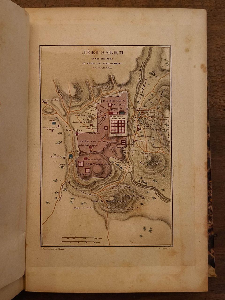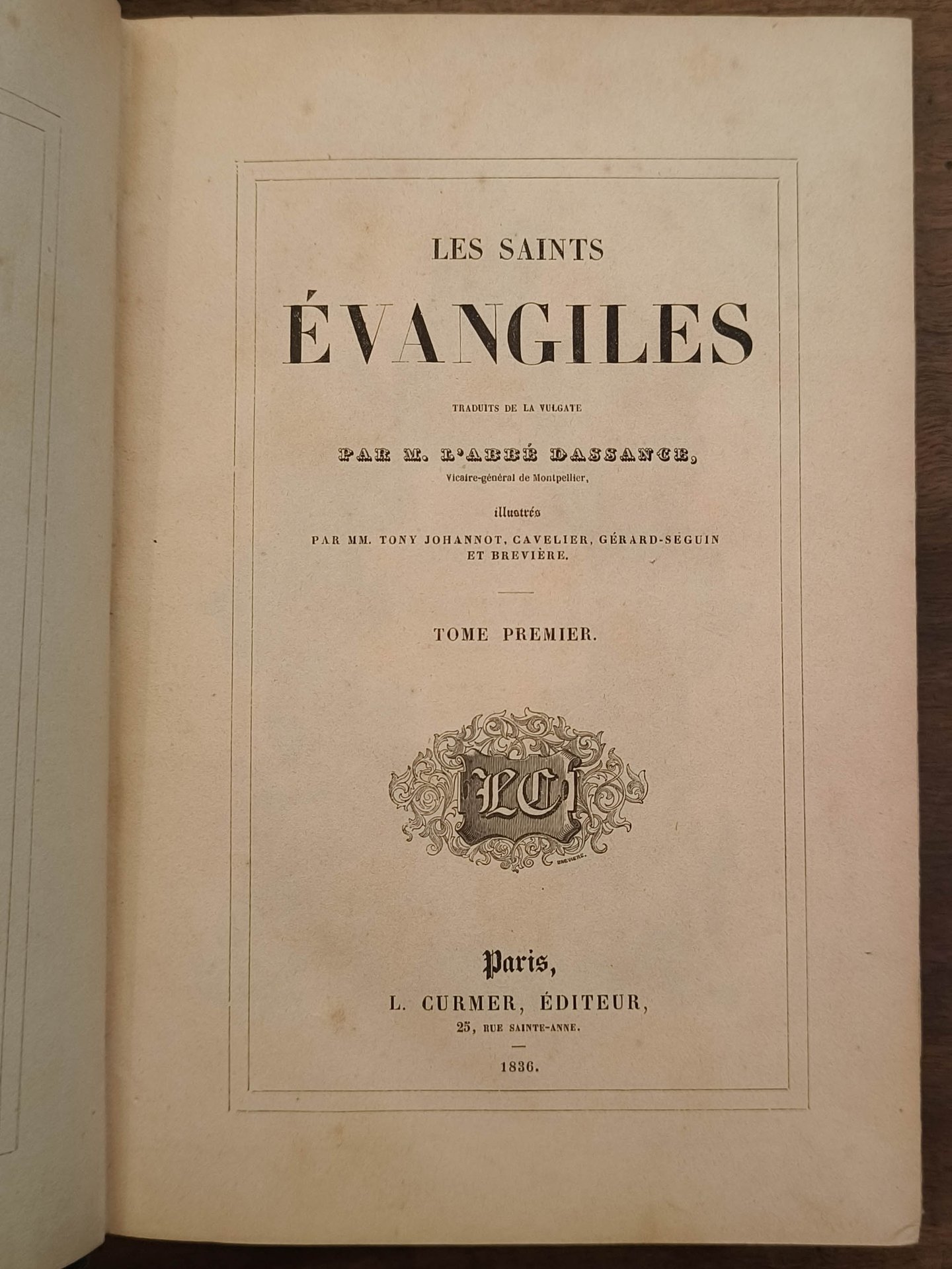 Les Saints Evangiles Traduits de la Vulgate par M. L' abbe Dassange, Parigi, Curmer, 1836. Prima edizione. Cm 26. Pp. LXXX 263 (4) 440 (2 volumi). Due volumi rilegati separatamente in mezza pelle. Autore, titolo e fregi impressi in oro al dorso. Piatti e dorso leggermente abrasi. 2 cartine geografiche a colori, 12 tavole incise in rame protette da velina parlante fuori testo di scene tratte dai Vangeli e 10 tavole di vedute di città e luoghi sacri. Antiporta del primo volume incisa e miniata a colori, prima carta della prefazione finemente miniata alla testata e al capolettera, le carte di testo incorniciate da fregio tipografico, vari capolettera figurati. L'intera parte iconografica è opera di Johannot, Cavelier, Gérard-Séguin e Brevière.
