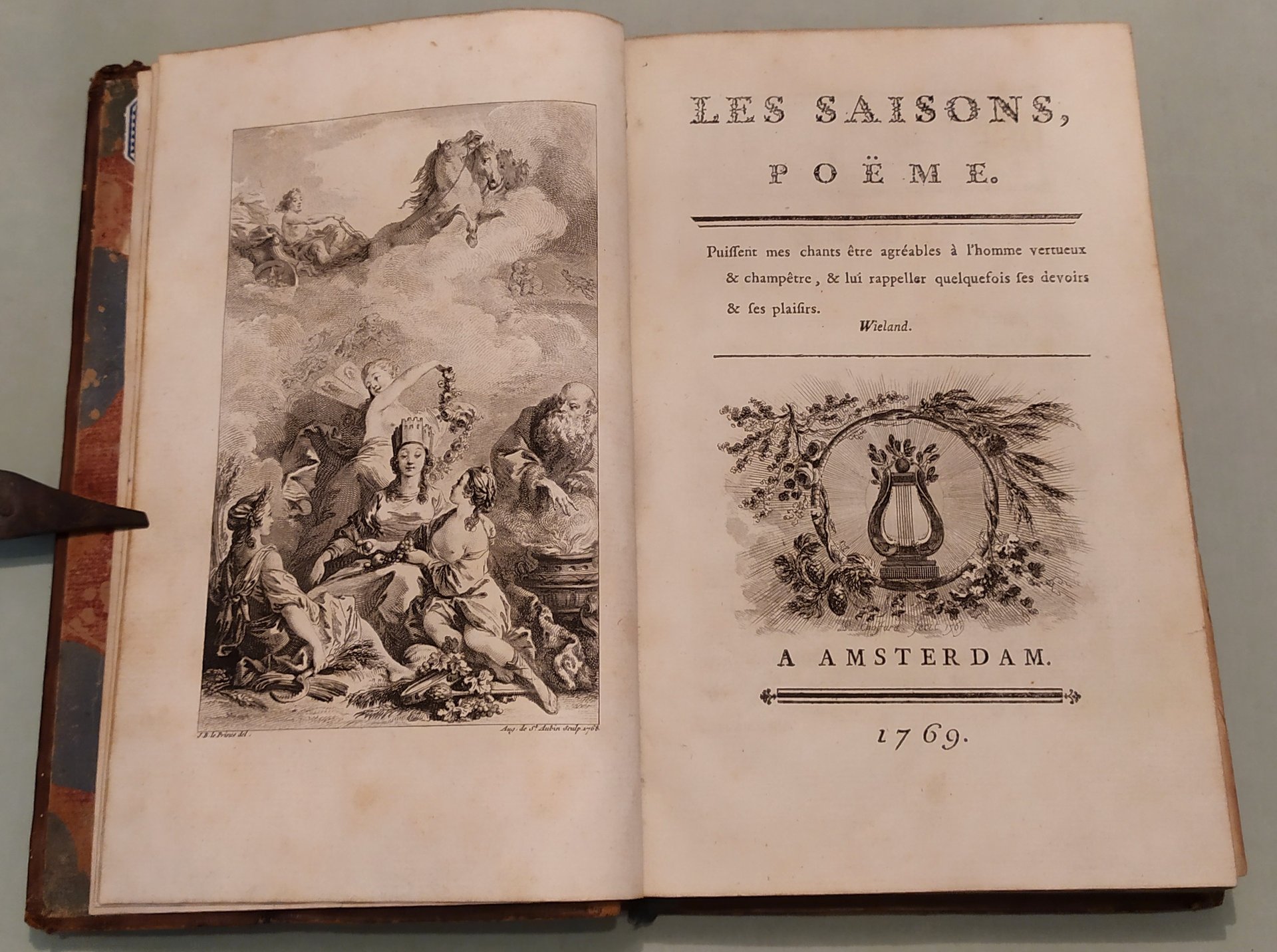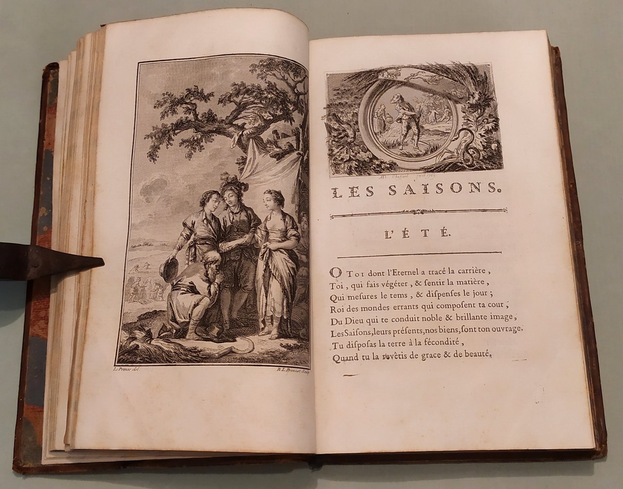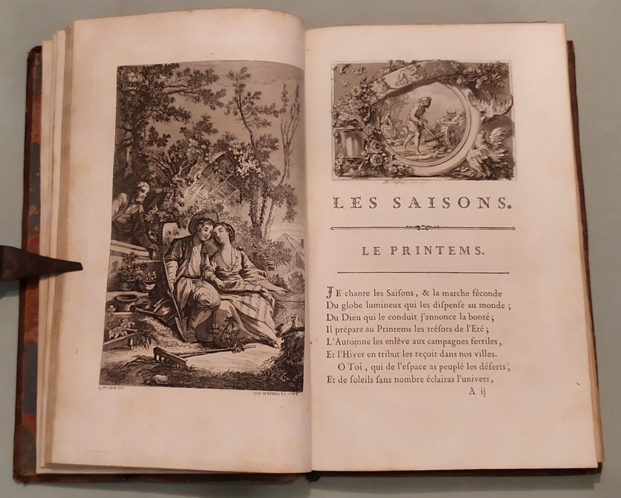 SAINT LAMBERT J.F. Les Saisons, poeme. A Amsterdam, 1769. In 8vo; pp. XXVIII, 369. 5 tavole di Le Prince e Gravelot incise da Delaunay, Prevost, Rousseau, Saint Aubin e Watelet. Al frontespizio vignetta con una lira. 4 testate incise all'acquaforte da Choffard. Finaletti. Legatura coeva in bazzana maculata, ai piatti filettatura dorata, dorso a cordoni con ricchi fregi e titolo in oro. Questa opera di carattere campestre e pastorale, pubblicata anonima a Parigi, può essere considerata una testimonianza schiettamente settecentesca del modo di intendere la poesia e la sua funzione sociale. Edizione originale. Cohen, 926.